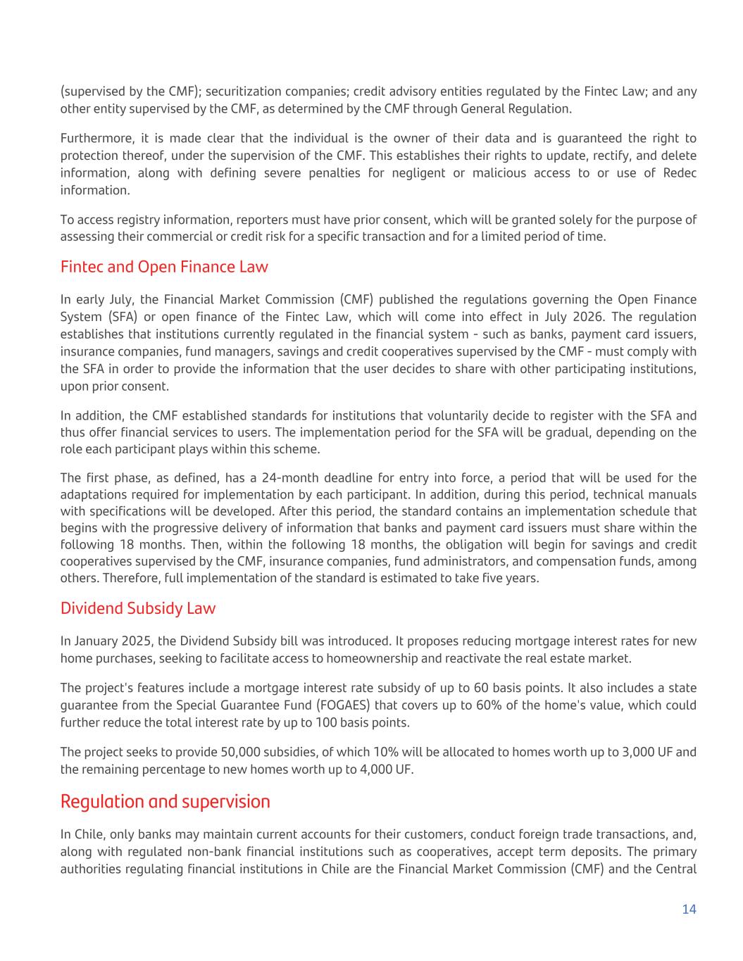 (supervised by the CMF); securitization companies; credit advisory entities regulated by the Fintec Law; and any other entity supervised by the CMF, as determined by the CMF through General Regulation. Furthermore, it is made clear that the individual is the owner of their data and is guaranteed the right to protection thereof, under the supervision of the CMF. This establishes their rights to update, rectify, and delete information, along with defining severe penalties for negligent or malicious access to or use of Redec information. To access registry information, reporters must have prior consent, which will be granted solely for the purpose of assessing their commercial or credit risk for a specific transaction and for a limited period of time. Fintec and Open Finance Law In early July, the Financial Market Commission (CMF) published the regulations governing the Open Finance System (SFA) or open finance of the Fintec Law, which will come into effect in July 2026. The regulation establishes that institutions currently regulated in the financial system - such as banks, payment card issuers, insurance companies, fund managers, savings and credit cooperatives supervised by the CMF - must comply with the SFA in order to provide the information that the user decides to share with other participating institutions, upon prior consent. In addition, the CMF established standards for institutions that voluntarily decide to register with the SFA and thus offer financial services to users. The implementation period for the SFA will be gradual, depending on the role each participant plays within this scheme. The first phase, as defined, has a 24-month deadline for entry into force, a period that will be used for the adaptations required for implementation by each participant. In addition, during this period, technical manuals with specifications will be developed. After this period, the standard contains an implementation schedule that begins with the progressive delivery of information that banks and payment card issuers must share within the following 18 months. Then, within the following 18 months, the obligation will begin for savings and credit cooperatives supervised by the CMF, insurance companies, fund administrators, and compensation funds, among others. Therefore, full implementation of the standard is estimated to take five years. Dividend Subsidy Law In January 2025, the Dividend Subsidy bill was introduced. It proposes reducing mortgage interest rates for new home purchases, seeking to facilitate access to homeownership and reactivate the real estate market. The project's features include a mortgage interest rate subsidy of up to 60 basis points. It also includes a state guarantee from the Special Guarantee Fund (FOGAES) that covers up to 60% of the home's value, which could further reduce the total interest rate by up to 100 basis points. The project seeks to provide 50,000 subsidies, of which 10% will be allocated to homes worth up to 3,000 UF and the remaining percentage to new homes worth up to 4,000 UF. Regulation and supervision In Chile, only banks may maintain current accounts for their customers, conduct foreign trade transactions, and, along with regulated non-bank financial institutions such as cooperatives, accept term deposits. The primary authorities regulating financial institutions in Chile are the Financial Market Commission (CMF) and the Central 14