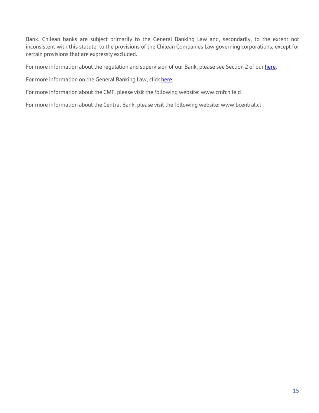 Bank. Chilean banks are subject primarily to the General Banking Law and, secondarily, to the extent not inconsistent with this statute, to the provisions of the Chilean Companies Law governing corporations, except for certain provisions that are expressly excluded. For more information about the regulation and supervision of our Bank, please see Section 2 of our here. For more information on the General Banking Law, click here. For more information about the CMF, please visit the following website: www.cmfchile.cl For more information about the Central Bank, please visit the following website: www.bcentral.cl 15