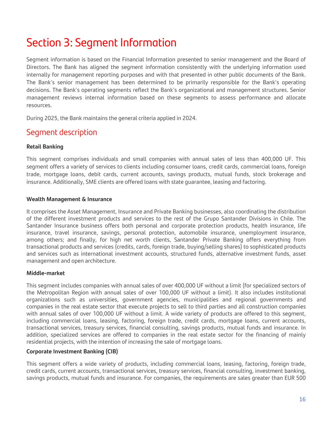 Section 3: Segment Information Segment information is based on the Financial Information presented to senior management and the Board of Directors. The Bank has aligned the segment information consistently with the underlying information used internally for management reporting purposes and with that presented in other public documents of the Bank. The Bank's senior management has been determined to be primarily responsible for the Bank's operating decisions. The Bank's operating segments reflect the Bank's organizational and management structures. Senior management reviews internal information based on these segments to assess performance and allocate resources. During 2025, the Bank maintains the general criteria applied in 2024. Segment description Retail Banking This segment comprises individuals and small companies with annual sales of less than 400,000 UF. This segment offers a variety of services to clients including consumer loans, credit cards, commercial loans, foreign trade, mortgage loans, debit cards, current accounts, savings products, mutual funds, stock brokerage and insurance. Additionally, SME clients are offered loans with state guarantee, leasing and factoring. Wealth Management & Insurance It comprises the Asset Management, Insurance and Private Banking businesses, also coordinating the distribution of the different investment products and services to the rest of the Grupo Santander Divisions in Chile. The Santander Insurance business offers both personal and corporate protection products, health insurance, life insurance, travel insurance, savings, personal protection, automobile insurance, unemployment insurance, among others; and finally, for high net worth clients, Santander Private Banking offers everything from transactional products and services (credits, cards, foreign trade, buying/selling shares) to sophisticated products and services such as international investment accounts, structured funds, alternative investment funds, asset management and open architecture. Middle-market This segment includes companies with annual sales of over 400,000 UF without a limit (for specialized sectors of the Metropolitan Region with annual sales of over 100,000 UF without a limit). It also includes institutional organizations such as universities, government agencies, municipalities and regional governments and companies in the real estate sector that execute projects to sell to third parties and all construction companies with annual sales of over 100,000 UF without a limit. A wide variety of products are offered to this segment, including commercial loans, leasing, factoring, foreign trade, credit cards, mortgage loans, current accounts, transactional services, treasury services, financial consulting, savings products, mutual funds and insurance. In addition, specialized services are offered to companies in the real estate sector for the financing of mainly residential projects, with the intention of increasing the sale of mortgage loans. Corporate Investment Banking (CIB) This segment offers a wide variety of products, including commercial loans, leasing, factoring, foreign trade, credit cards, current accounts, transactional services, treasury services, financial consulting, investment banking, savings products, mutual funds and insurance. For companies, the requirements are sales greater than EUR 500 16