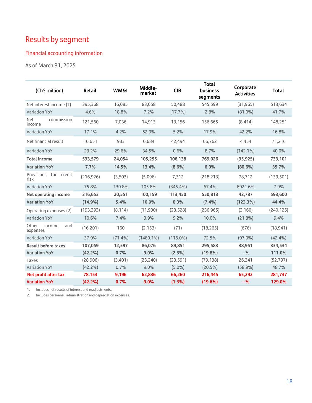 Results by segment Financial accounting information As of March 31, 2025 (Ch$ million) Retail WM&I Middle- market CIB Total business segments Corporate Activities Total Net interest income (1) 395,368 16,085 83,658 50,488 545,599 (31,965) 513,634 Variation YoY 4.6% 18.8% 7.2% (17.7%) 2.8% (81.0%) 41.7% Net commission income 121,560 7,036 14,913 13,156 156,665 (8,414) 148,251 Variation YoY 17.1% 4.2% 52.9% 5.2% 17.9% 42.2% 16.8% Net financial result 16,651 933 6,684 42,494 66,762 4,454 71,216 Variation YoY 23.2% 29.6% 34.5% 0.6% 8.7% (142.1%) 40.0% Total income 533,579 24,054 105,255 106,138 769,026 (35,925) 733,101 Variation YoY 7.7% 14.5% 13.4% (8.6%) 6.0% (80.6%) 35.7% Provisions for credit risk (216,926) (3,503) (5,096) 7,312 (218,213) 78,712 (139,501) Variation YoY 75.8% 130.8% 105.8% (345.4%) 67.4% 6921.6% 7.9% Net operating income 316,653 20,551 100,159 113,450 550,813 42,787 593,600 Variation YoY (14.9%) 5.4% 10.9% 0.3% (7.4%) (123.3%) 44.4% Operating expenses (2) (193,393) (8,114) (11,930) (23,528) (236,965) (3,160) (240,125) Variation YoY 10.6% 7.4% 3.9% 9.2% 10.0% (21.8%) 9.4% Other income and expenses (16,201) 160 (2,153) (71) (18,265) (676) (18,941) Variation YoY 37.9% (71.4%) (1480.1%) (116.0%) 72.5% (97.0%) (42.4%) Result before taxes 107,059 12,597 86,076 89,851 295,583 38,951 334,534 Variation YoY (42.2%) 0.7% 9.0% (2.3%) (19.8%) --% 111.0% Taxes (28,906) (3,401) (23,240) (23,591) (79,138) 26,341 (52,797) Variation YoY (42.2%) 0.7% 9.0% (5.0%) (20.5%) (58.9%) 48.7% Net profit after tax 78,153 9,196 62,836 66,260 216,445 65,292 281,737 Variation YoY (42.2%) 0.7% 9.0% (1.3%) (19.6%) --% 129.0% 1. Includes net results of interest and readjustments. 2. Includes personnel, administration and depreciation expenses. 18