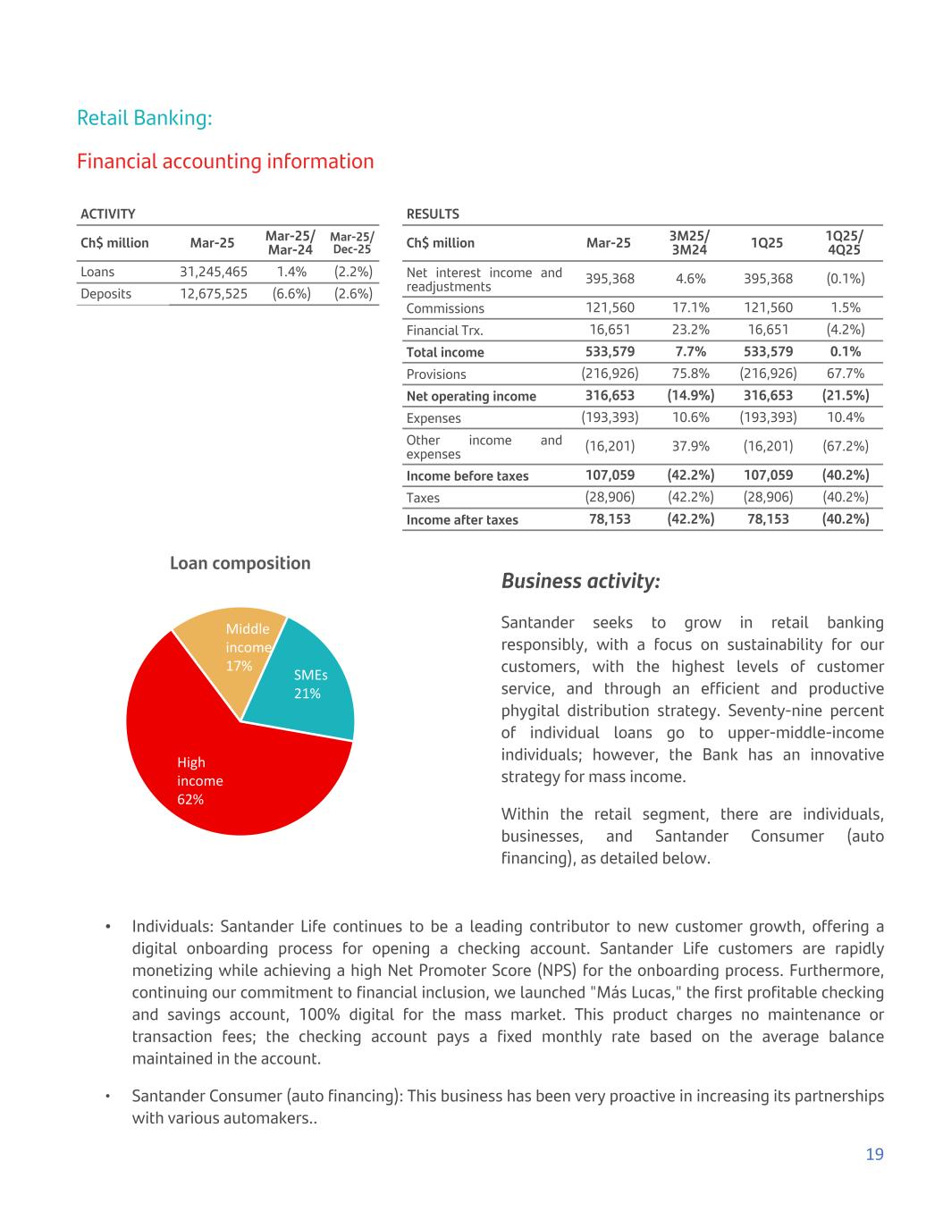 Retail Banking: Financial accounting information ACTIVITY Ch$ million Mar-25 Mar-25/ Mar-24 Mar-25/ Dec-25 Loans 31,245,465 1.4% (2.2%) Deposits 12,675,525 (6.6%) (2.6%) RESULTS Ch$ million Mar-25 3M25/ 3M24 1Q25 1Q25/ 4Q25 Net interest income and readjustments 395,368 4.6% 395,368 (0.1%) Commissions 121,560 17.1% 121,560 1.5% Financial Trx. 16,651 23.2% 16,651 (4.2%) Total income 533,579 7.7% 533,579 0.1% Provisions (216,926) 75.8% (216,926) 67.7% Net operating income 316,653 (14.9%) 316,653 (21.5%) Expenses (193,393) 10.6% (193,393) 10.4% Other income and expenses (16,201) 37.9% (16,201) (67.2%) Income before taxes 107,059 (42.2%) 107,059 (40.2%) Taxes (28,906) (42.2%) (28,906) (40.2%) Income after taxes 78,153 (42.2%) 78,153 (40.2%) Loan composition High income 62% Middle income 17% SMEs 21% Business activity: Santander seeks to grow in retail banking responsibly, with a focus on sustainability for our customers, with the highest levels of customer service, and through an efficient and productive phygital distribution strategy. Seventy-nine percent of individual loans go to upper-middle-income individuals; however, the Bank has an innovative strategy for mass income. Within the retail segment, there are individuals, businesses, and Santander Consumer (auto financing), as detailed below. • Individuals: Santander Life continues to be a leading contributor to new customer growth, offering a digital onboarding process for opening a checking account. Santander Life customers are rapidly monetizing while achieving a high Net Promoter Score (NPS) for the onboarding process. Furthermore, continuing our commitment to financial inclusion, we launched "Más Lucas," the first profitable checking and savings account, 100% digital for the mass market. This product charges no maintenance or transaction fees; the checking account pays a fixed monthly rate based on the average balance maintained in the account. • Santander Consumer (auto financing): This business has been very proactive in increasing its partnerships with various automakers.. 19
