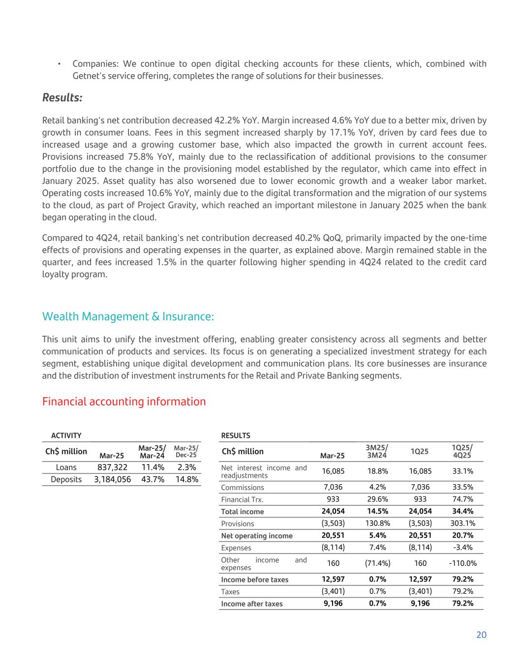 • Companies: We continue to open digital checking accounts for these clients, which, combined with Getnet's service offering, completes the range of solutions for their businesses. Results: Retail banking's net contribution decreased 42.2% YoY. Margin increased 4.6% YoY due to a better mix, driven by growth in consumer loans. Fees in this segment increased sharply by 17.1% YoY, driven by card fees due to increased usage and a growing customer base, which also impacted the growth in current account fees. Provisions increased 75.8% YoY, mainly due to the reclassification of additional provisions to the consumer portfolio due to the change in the provisioning model established by the regulator, which came into effect in January 2025. Asset quality has also worsened due to lower economic growth and a weaker labor market. Operating costs increased 10.6% YoY, mainly due to the digital transformation and the migration of our systems to the cloud, as part of Project Gravity, which reached an important milestone in January 2025 when the bank began operating in the cloud. Compared to 4Q24, retail banking's net contribution decreased 40.2% QoQ, primarily impacted by the one-time effects of provisions and operating expenses in the quarter, as explained above. Margin remained stable in the quarter, and fees increased 1.5% in the quarter following higher spending in 4Q24 related to the credit card loyalty program. Wealth Management & Insurance: This unit aims to unify the investment offering, enabling greater consistency across all segments and better communication of products and services. Its focus is on generating a specialized investment strategy for each segment, establishing unique digital development and communication plans. Its core businesses are insurance and the distribution of investment instruments for the Retail and Private Banking segments. Financial accounting information ACTIVITY Ch$ million Mar-25 Mar-25/ Mar-24 Mar-25/ Dec-25 Loans 837,322 11.4% 2.3% Deposits 3,184,056 43.7% 14.8% RESULTS Ch$ million Mar-25 3M25/ 3M24 1Q25 1Q25/ 4Q25 Net interest income and readjustments 16,085 18.8% 16,085 33.1% Commissions 7,036 4.2% 7,036 33.5% Financial Trx. 933 29.6% 933 74.7% Total income 24,054 14.5% 24,054 34.4% Provisions (3,503) 130.8% (3,503) 303.1% Net operating income 20,551 5.4% 20,551 20.7% Expenses (8,114) 7.4% (8,114) -3.4% Other income and expenses 160 (71.4%) 160 -110.0% Income before taxes 12,597 0.7% 12,597 79.2% Taxes (3,401) 0.7% (3,401) 79.2% Income after taxes 9,196 0.7% 9,196 79.2% 20