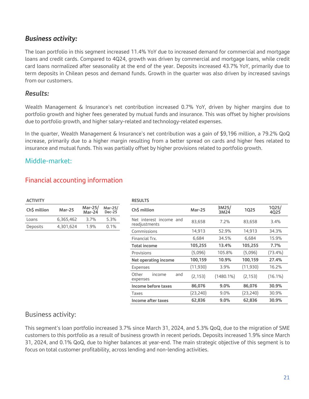 Business activity: The loan portfolio in this segment increased 11.4% YoY due to increased demand for commercial and mortgage loans and credit cards. Compared to 4Q24, growth was driven by commercial and mortgage loans, while credit card loans normalized after seasonality at the end of the year. Deposits increased 43.7% YoY, primarily due to term deposits in Chilean pesos and demand funds. Growth in the quarter was also driven by increased savings from our customers. Results: Wealth Management & Insurance's net contribution increased 0.7% YoY, driven by higher margins due to portfolio growth and higher fees generated by mutual funds and insurance. This was offset by higher provisions due to portfolio growth, and higher salary-related and technology-related expenses. In the quarter, Wealth Management & Insurance's net contribution was a gain of $9,196 million, a 79.2% QoQ increase, primarily due to a higher margin resulting from a better spread on cards and higher fees related to insurance and mutual funds. This was partially offset by higher provisions related to portfolio growth. Middle-market: Financial accounting information ACTIVITY Ch$ million Mar-25 Mar-25/ Mar-24 Mar-25/ Dec-25 Loans 6,365,462 3.7% 5.3% Deposits 4,301,624 1.9% 0.1% RESULTS Ch$ million Mar-25 3M25/ 3M24 1Q25 1Q25/ 4Q25 Net interest income and readjustments 83,658 7.2% 83,658 3.4% Commissions 14,913 52.9% 14,913 34.3% Financial Trx. 6,684 34.5% 6,684 15.9% Total income 105,255 13.4% 105,255 7.7% Provisions (5,096) 105.8% (5,096) (73.4%) Net operating income 100,159 10.9% 100,159 27.4% Expenses (11,930) 3.9% (11,930) 16.2% Other income and expenses (2,153) (1480.1%) (2,153) (16.1%) Income before taxes 86,076 9.0% 86,076 30.9% Taxes (23,240) 9.0% (23,240) 30.9% Income after taxes 62,836 9.0% 62,836 30.9% Business activity: This segment's loan portfolio increased 3.7% since March 31, 2024, and 5.3% QoQ, due to the migration of SME customers to this portfolio as a result of business growth in recent periods. Deposits increased 1.9% since March 31, 2024, and 0.1% QoQ, due to higher balances at year-end. The main strategic objective of this segment is to focus on total customer profitability, across lending and non-lending activities. 21