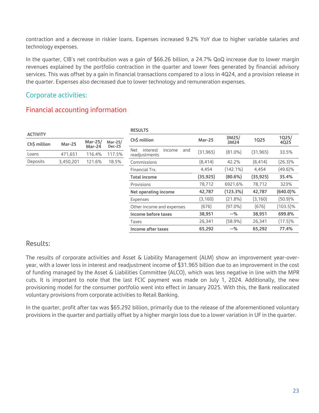 contraction and a decrease in riskier loans. Expenses increased 9.2% YoY due to higher variable salaries and technology expenses. In the quarter, CIB's net contribution was a gain of $66.26 billion, a 24.7% QoQ increase due to lower margin revenues explained by the portfolio contraction in the quarter and lower fees generated by financial advisory services. This was offset by a gain in financial transactions compared to a loss in 4Q24, and a provision release in the quarter. Expenses also decreased due to lower technology and remuneration expenses. Corporate activities: Financial accounting information ACTIVITY Ch$ million Mar-25 Mar-25/ Mar-24 Mar-25/ Dec-25 Loans 471,651 116.4% 117.5% Deposits 3,450,201 121.6% 18.5% RESULTS Ch$ million Mar-25 3M25/ 3M24 1Q25 1Q25/ 4Q25 Net interest income and readjustments (31,965) (81.0%) (31,965) 33.5% Commissions (8,414) 42.2% (8,414) (26.3)% Financial Trx. 4,454 (142.1%) 4,454 (49.6)% Total income (35,925) (80.6%) (35,925) 35.4% Provisions 78,712 6921.6% 78,712 323% Net operating income 42,787 (123.3%) 42,787 (640.0)% Expenses (3,160) (21.8%) (3,160) (50.9)% Other income and expenses (676) (97.0%) (676) (103.5)% Income before taxes 38,951 --% 38,951 699.8% Taxes 26,341 (58.9%) 26,341 (17.5)% Income after taxes 65,292 --% 65,292 77.4% Results: The results of corporate activities and Asset & Liability Management (ALM) show an improvement year-over- year, with a lower loss in interest and readjustment income of $31.965 billion due to an improvement in the cost of funding managed by the Asset & Liabilities Committee (ALCO), which was less negative in line with the MPR cuts. It is important to note that the last FCIC payment was made on July 1, 2024. Additionally, the new provisioning model for the consumer portfolio went into effect in January 2025. With this, the Bank reallocated voluntary provisions from corporate activities to Retail Banking. In the quarter, profit after tax was $65.292 billion, primarily due to the release of the aforementioned voluntary provisions in the quarter and partially offset by a higher margin loss due to a lower variation in UF in the quarter. 23