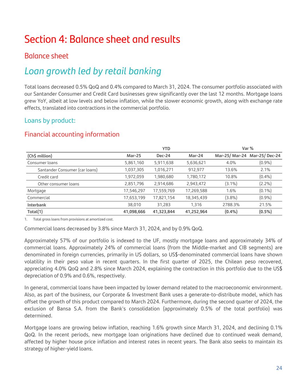 Section 4: Balance sheet and results Balance sheet Loan growth led by retail banking Total loans decreased 0.5% QoQ and 0.4% compared to March 31, 2024. The consumer portfolio associated with our Santander Consumer and Credit Card businesses grew significantly over the last 12 months. Mortgage loans grew YoY, albeit at low levels and below inflation, while the slower economic growth, along with exchange rate effects, translated into contractions in the commercial portfolio. Loans by product: Financial accounting information YTD Var % (Ch$ million) Mar-25 Dec-24 Mar-24 Mar-25/ Mar-24 Mar-25/ Dec-24 Consumer loans 5,861,160 5,911,638 5,636,621 4.0% (0.9%) Santander Consumer (car loans) 1,037,305 1,016,271 912,977 13.6% 2.1% Credit card 1,972,059 1,980,680 1,780,172 10.8% (0.4%) Other consumer loans 2,851,796 2,914,686 2,943,472 (3.1%) (2.2%) Mortgage 17,546,297 17,559,769 17,269,588 1.6% (0.1%) Commercial 17,653,199 17,821,154 18,345,439 (3.8%) (0.9%) Interbank 38,010 31,283 1,316 2788.3% 21.5% Total(1) 41,098,666 41,323,844 41,252,964 (0.4%) (0.5%) 1. Total gross loans from provisions at amortized cost. Commercial loans decreased by 3.8% since March 31, 2024, and by 0.9% QoQ. Approximately 57% of our portfolio is indexed to the UF, mostly mortgage loans and approximately 34% of commercial loans. Approximately 24% of commercial loans (from the Middle-market and CIB segments) are denominated in foreign currencies, primarily in US dollars, so US$-denominated commercial loans have shown volatility in their peso value in recent quarters. In the first quarter of 2025, the Chilean peso recovered, appreciating 4.0% QoQ and 2.8% since March 2024, explaining the contraction in this portfolio due to the US$ depreciation of 0.9% and 0.6%, respectively. In general, commercial loans have been impacted by lower demand related to the macroeconomic environment. Also, as part of the business, our Corporate & Investment Bank uses a generate-to-distribute model, which has offset the growth of this product compared to March 2024. Furthermore, during the second quarter of 2024, the exclusion of Bansa S.A. from the Bank's consolidation (approximately 0.5% of the total portfolio) was determined. Mortgage loans are growing below inflation, reaching 1.6% growth since March 31, 2024, and declining 0.1% QoQ. In the recent periods, new mortgage loan originations have declined due to continued weak demand, affected by higher house price inflation and interest rates in recent years. The Bank also seeks to maintain its strategy of higher-yield loans. 24