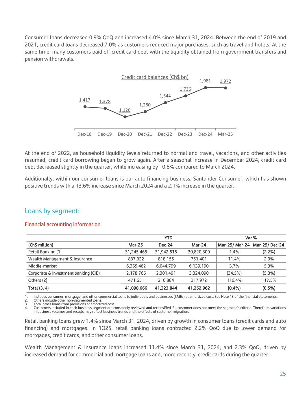 Consumer loans decreased 0.9% QoQ and increased 4.0% since March 31, 2024. Between the end of 2019 and 2021, credit card loans decreased 7.0% as customers reduced major purchases, such as travel and hotels. At the same time, many customers paid off credit card debt with the liquidity obtained from government transfers and pension withdrawals. Credit card balances (Ch$ bn) 1,417 1,378 1,126 1,280 1,544 1,736 1,981 1,972 Dec-18 Dec-19 Dec-20 Dec-21 Dec-22 Dec-23 Dec-24 Mar-25 At the end of 2022, as household liquidity levels returned to normal and travel, vacations, and other activities resumed, credit card borrowing began to grow again. After a seasonal increase in December 2024, credit card debt decreased slightly in the quarter, while increasing by 10.8% compared to March 2024. Additionally, within our consumer loans is our auto financing business, Santander Consumer, which has shown positive trends with a 13.6% increase since March 2024 and a 2.1% increase in the quarter. Loans by segment: Financial accounting information YTD Var % (Ch$ million) Mar-25 Dec-24 Mar-24 Mar-25/ Mar-24 Mar-25/ Dec-24 Retail Banking (1) 31,245,465 31,942,515 30,820,309 1.4% (2.2%) Wealth Management & Insurance 837,322 818,155 751,401 11.4% 2.3% Middle-market 6,365,462 6,044,799 6,139,190 3.7% 5.3% Corporate & Investment banking (CIB) 2,178,766 2,301,491 3,324,090 (34.5%) (5.3%) Others (2) 471,651 216,884 217,972 116.4% 117.5% Total (3, 4) 41,098,666 41,323,844 41,252,962 (0.4%) (0.5%) 1. Includes consumer, mortgage, and other commercial loans to individuals and businesses (SMEs) at amortized cost. See Note 13 of the financial statements. 2. Others include other non-segmented loans. 3. Total gross loans from provisions at amortized cost. 4. Customers included in each business segment are constantly reviewed and reclassified if a customer does not meet the segment's criteria. Therefore, variations in business volumes and results may reflect business trends and the effects of customer migration. Retail banking loans grew 1.4% since March 31, 2024, driven by growth in consumer loans (credit cards and auto financing) and mortgages. In 1Q25, retail banking loans contracted 2.2% QoQ due to lower demand for mortgages, credit cards, and other consumer loans. Wealth Management & Insurance loans increased 11.4% since March 31, 2024, and 2.3% QoQ, driven by increased demand for commercial and mortgage loans and, more recently, credit cards during the quarter. 25