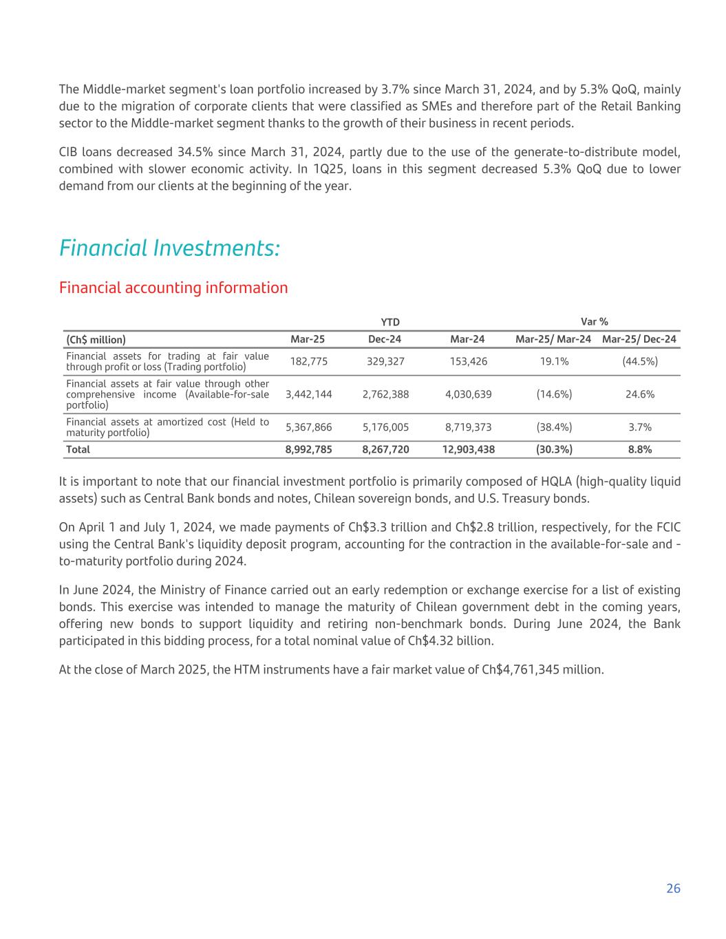 The Middle-market segment's loan portfolio increased by 3.7% since March 31, 2024, and by 5.3% QoQ, mainly due to the migration of corporate clients that were classified as SMEs and therefore part of the Retail Banking sector to the Middle-market segment thanks to the growth of their business in recent periods. CIB loans decreased 34.5% since March 31, 2024, partly due to the use of the generate-to-distribute model, combined with slower economic activity. In 1Q25, loans in this segment decreased 5.3% QoQ due to lower demand from our clients at the beginning of the year. Financial Investments: Financial accounting information YTD Var % (Ch$ million) Mar-25 Dec-24 Mar-24 Mar-25/ Mar-24 Mar-25/ Dec-24 Financial assets for trading at fair value through profit or loss (Trading portfolio) 182,775 329,327 153,426 19.1% (44.5%) Financial assets at fair value through other comprehensive income (Available-for-sale portfolio) 3,442,144 2,762,388 4,030,639 (14.6%) 24.6% Financial assets at amortized cost (Held to maturity portfolio) 5,367,866 5,176,005 8,719,373 (38.4%) 3.7% Total 8,992,785 8,267,720 12,903,438 (30.3%) 8.8% It is important to note that our financial investment portfolio is primarily composed of HQLA (high-quality liquid assets) such as Central Bank bonds and notes, Chilean sovereign bonds, and U.S. Treasury bonds. On April 1 and July 1, 2024, we made payments of Ch$3.3 trillion and Ch$2.8 trillion, respectively, for the FCIC using the Central Bank's liquidity deposit program, accounting for the contraction in the available-for-sale and - to-maturity portfolio during 2024. In June 2024, the Ministry of Finance carried out an early redemption or exchange exercise for a list of existing bonds. This exercise was intended to manage the maturity of Chilean government debt in the coming years, offering new bonds to support liquidity and retiring non-benchmark bonds. During June 2024, the Bank participated in this bidding process, for a total nominal value of Ch$4.32 billion. At the close of March 2025, the HTM instruments have a fair market value of Ch$4,761,345 million. 26