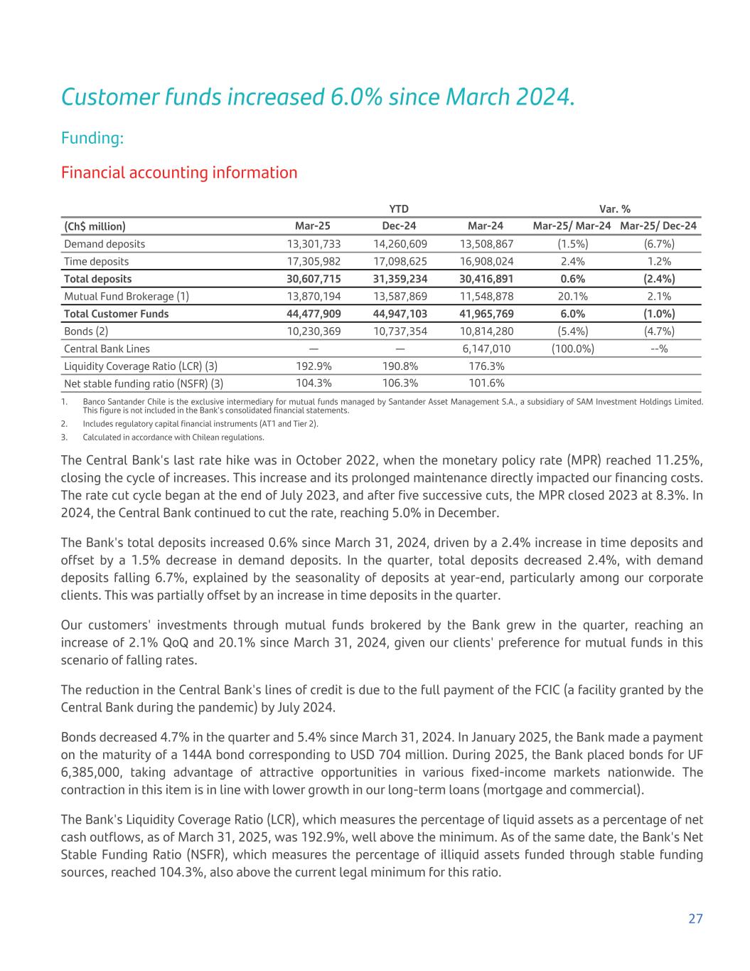 Customer funds increased 6.0% since March 2024. Funding: Financial accounting information YTD Var. % (Ch$ million) Mar-25 Dec-24 Mar-24 Mar-25/ Mar-24 Mar-25/ Dec-24 Demand deposits 13,301,733 14,260,609 13,508,867 (1.5%) (6.7%) Time deposits 17,305,982 17,098,625 16,908,024 2.4% 1.2% Total deposits 30,607,715 31,359,234 30,416,891 0.6% (2.4%) Mutual Fund Brokerage (1) 13,870,194 13,587,869 11,548,878 20.1% 2.1% Total Customer Funds 44,477,909 44,947,103 41,965,769 6.0% (1.0%) Bonds (2) 10,230,369 10,737,354 10,814,280 (5.4%) (4.7%) Central Bank Lines — — 6,147,010 (100.0%) --% Liquidity Coverage Ratio (LCR) (3) 192.9% 190.8% 176.3% Net stable funding ratio (NSFR) (3) 104.3% 106.3% 101.6% 1. Banco Santander Chile is the exclusive intermediary for mutual funds managed by Santander Asset Management S.A., a subsidiary of SAM Investment Holdings Limited. This figure is not included in the Bank's consolidated financial statements. 2. Includes regulatory capital financial instruments (AT1 and Tier 2). 3. Calculated in accordance with Chilean regulations. The Central Bank's last rate hike was in October 2022, when the monetary policy rate (MPR) reached 11.25%, closing the cycle of increases. This increase and its prolonged maintenance directly impacted our financing costs. The rate cut cycle began at the end of July 2023, and after five successive cuts, the MPR closed 2023 at 8.3%. In 2024, the Central Bank continued to cut the rate, reaching 5.0% in December. The Bank's total deposits increased 0.6% since March 31, 2024, driven by a 2.4% increase in time deposits and offset by a 1.5% decrease in demand deposits. In the quarter, total deposits decreased 2.4%, with demand deposits falling 6.7%, explained by the seasonality of deposits at year-end, particularly among our corporate clients. This was partially offset by an increase in time deposits in the quarter. Our customers' investments through mutual funds brokered by the Bank grew in the quarter, reaching an increase of 2.1% QoQ and 20.1% since March 31, 2024, given our clients' preference for mutual funds in this scenario of falling rates. The reduction in the Central Bank's lines of credit is due to the full payment of the FCIC (a facility granted by the Central Bank during the pandemic) by July 2024. Bonds decreased 4.7% in the quarter and 5.4% since March 31, 2024. In January 2025, the Bank made a payment on the maturity of a 144A bond corresponding to USD 704 million. During 2025, the Bank placed bonds for UF 6,385,000, taking advantage of attractive opportunities in various fixed-income markets nationwide. The contraction in this item is in line with lower growth in our long-term loans (mortgage and commercial). The Bank's Liquidity Coverage Ratio (LCR), which measures the percentage of liquid assets as a percentage of net cash outflows, as of March 31, 2025, was 192.9%, well above the minimum. As of the same date, the Bank's Net Stable Funding Ratio (NSFR), which measures the percentage of illiquid assets funded through stable funding sources, reached 104.3%, also above the current legal minimum for this ratio. 27