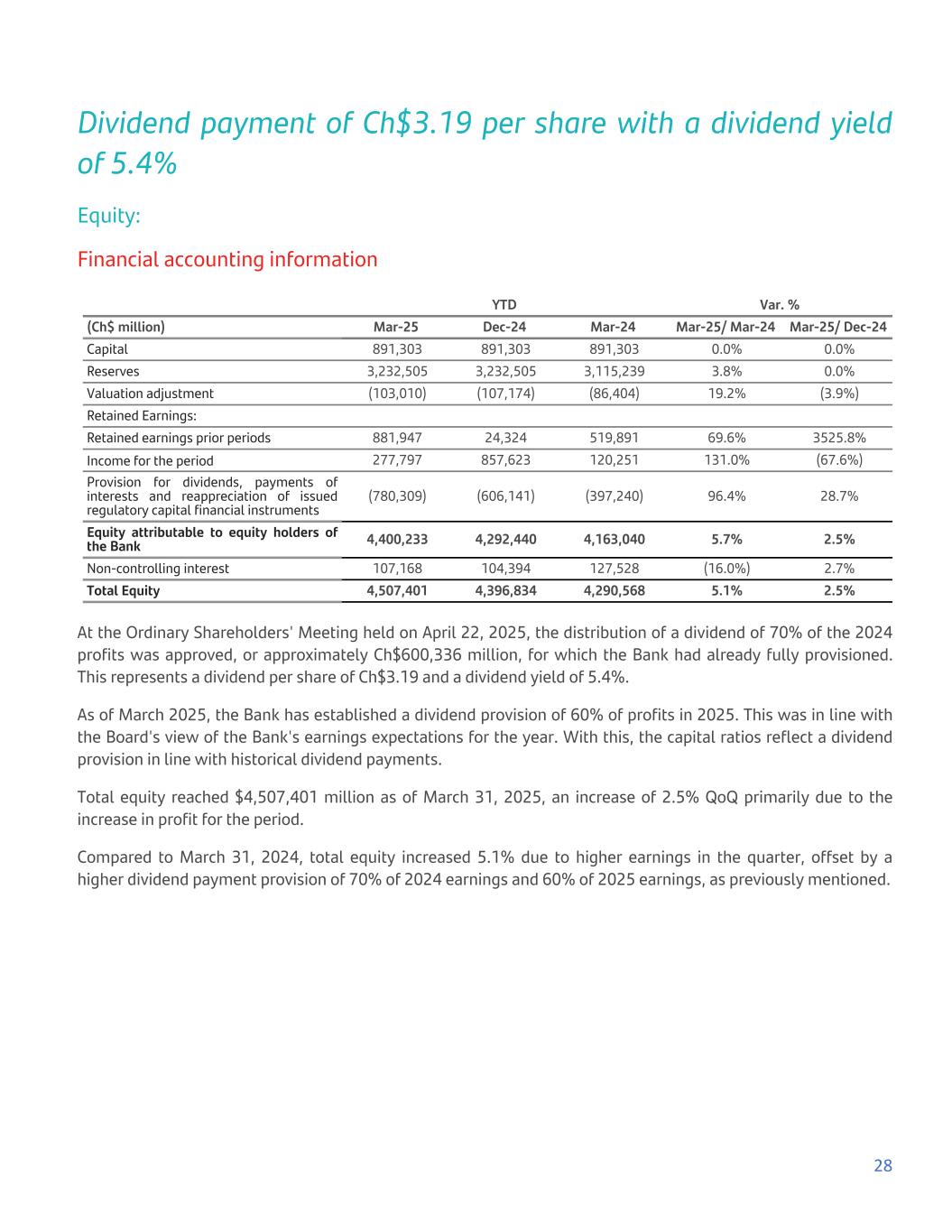 Dividend payment of Ch$3.19 per share with a dividend yield of 5.4% Equity: Financial accounting information YTD Var. % (Ch$ million) Mar-25 Dec-24 Mar-24 Mar-25/ Mar-24 Mar-25/ Dec-24 Capital 891,303 891,303 891,303 0.0% 0.0% Reserves 3,232,505 3,232,505 3,115,239 3.8% 0.0% Valuation adjustment (103,010) (107,174) (86,404) 19.2% (3.9%) Retained Earnings: Retained earnings prior periods 881,947 24,324 519,891 69.6% 3525.8% Income for the period 277,797 857,623 120,251 131.0% (67.6%) Provision for dividends, payments of interests and reappreciation of issued regulatory capital financial instruments (780,309) (606,141) (397,240) 96.4% 28.7% Equity attributable to equity holders of the Bank 4,400,233 4,292,440 4,163,040 5.7% 2.5% Non-controlling interest 107,168 104,394 127,528 (16.0%) 2.7% Total Equity 4,507,401 4,396,834 4,290,568 5.1% 2.5% At the Ordinary Shareholders' Meeting held on April 22, 2025, the distribution of a dividend of 70% of the 2024 profits was approved, or approximately Ch$600,336 million, for which the Bank had already fully provisioned. This represents a dividend per share of Ch$3.19 and a dividend yield of 5.4%. As of March 2025, the Bank has established a dividend provision of 60% of profits in 2025. This was in line with the Board's view of the Bank's earnings expectations for the year. With this, the capital ratios reflect a dividend provision in line with historical dividend payments. Total equity reached $4,507,401 million as of March 31, 2025, an increase of 2.5% QoQ primarily due to the increase in profit for the period. Compared to March 31, 2024, total equity increased 5.1% due to higher earnings in the quarter, offset by a higher dividend payment provision of 70% of 2024 earnings and 60% of 2025 earnings, as previously mentioned. 28