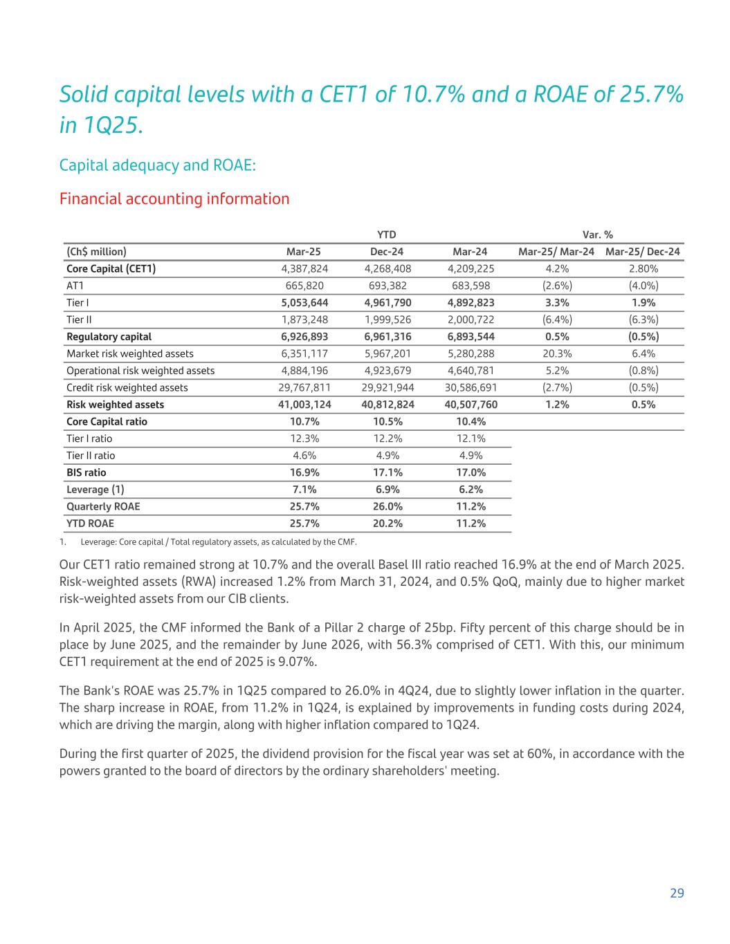 Solid capital levels with a CET1 of 10.7% and a ROAE of 25.7% in 1Q25. Capital adequacy and ROAE: Financial accounting information YTD Var. % (Ch$ million) Mar-25 Dec-24 Mar-24 Mar-25/ Mar-24 Mar-25/ Dec-24 Core Capital (CET1) 4,387,824 4,268,408 4,209,225 4.2% 2.80% AT1 665,820 693,382 683,598 (2.6%) (4.0%) Tier I 5,053,644 4,961,790 4,892,823 3.3% 1.9% Tier II 1,873,248 1,999,526 2,000,722 (6.4%) (6.3%) Regulatory capital 6,926,893 6,961,316 6,893,544 0.5% (0.5%) Market risk weighted assets 6,351,117 5,967,201 5,280,288 20.3% 6.4% Operational risk weighted assets 4,884,196 4,923,679 4,640,781 5.2% (0.8%) Credit risk weighted assets 29,767,811 29,921,944 30,586,691 (2.7%) (0.5%) Risk weighted assets 41,003,124 40,812,824 40,507,760 1.2% 0.5% Core Capital ratio 10.7% 10.5% 10.4% Tier I ratio 12.3% 12.2% 12.1% Tier II ratio 4.6% 4.9% 4.9% BIS ratio 16.9% 17.1% 17.0% Leverage (1) 7.1% 6.9% 6.2% Quarterly ROAE 25.7% 26.0% 11.2% YTD ROAE 25.7% 20.2% 11.2% 1. Leverage: Core capital / Total regulatory assets, as calculated by the CMF. Our CET1 ratio remained strong at 10.7% and the overall Basel III ratio reached 16.9% at the end of March 2025. Risk-weighted assets (RWA) increased 1.2% from March 31, 2024, and 0.5% QoQ, mainly due to higher market risk-weighted assets from our CIB clients. In April 2025, the CMF informed the Bank of a Pillar 2 charge of 25bp. Fifty percent of this charge should be in place by June 2025, and the remainder by June 2026, with 56.3% comprised of CET1. With this, our minimum CET1 requirement at the end of 2025 is 9.07%. The Bank's ROAE was 25.7% in 1Q25 compared to 26.0% in 4Q24, due to slightly lower inflation in the quarter. The sharp increase in ROAE, from 11.2% in 1Q24, is explained by improvements in funding costs during 2024, which are driving the margin, along with higher inflation compared to 1Q24. During the first quarter of 2025, the dividend provision for the fiscal year was set at 60%, in accordance with the powers granted to the board of directors by the ordinary shareholders' meeting. 29