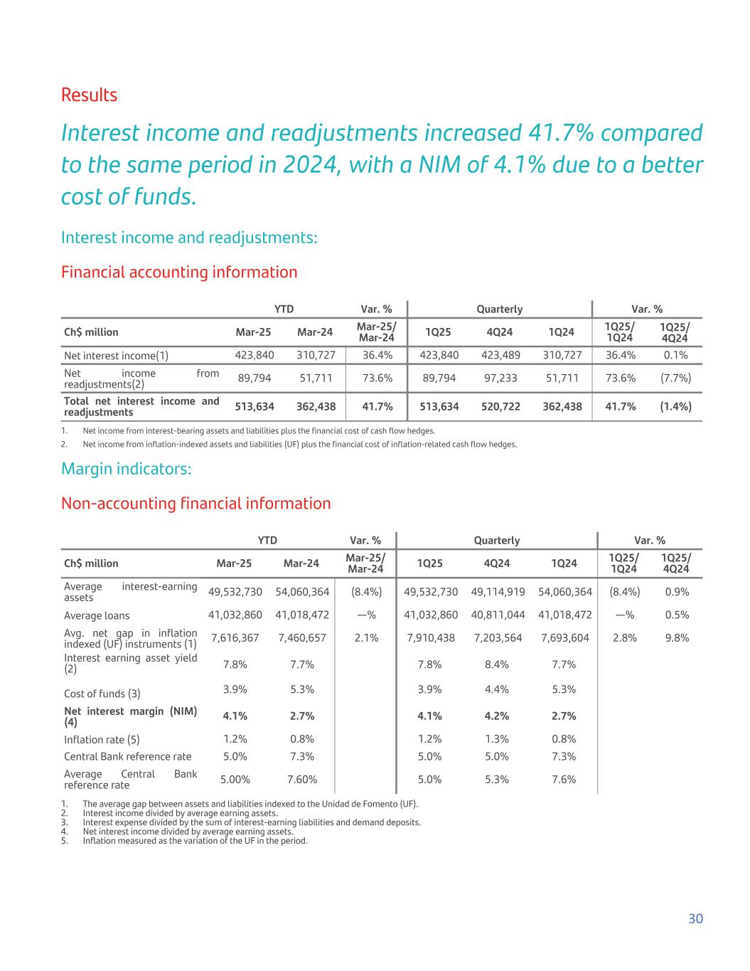 Results Interest income and readjustments increased 41.7% compared to the same period in 2024, with a NIM of 4.1% due to a better cost of funds. Interest income and readjustments: Financial accounting information YTD Var. % Quarterly Var. % Ch$ million Mar-25 Mar-24 Mar-25/ Mar-24 1Q25 4Q24 1Q24 1Q25/ 1Q24 1Q25/ 4Q24 Net interest income(1) 423,840 310,727 36.4% 423,840 423,489 310,727 36.4% 0.1% Net income from readjustments(2) 89,794 51,711 73.6% 89,794 97,233 51,711 73.6% (7.7%) Total net interest income and readjustments 513,634 362,438 41.7% 513,634 520,722 362,438 41.7% (1.4%) 1. Net income from interest-bearing assets and liabilities plus the financial cost of cash flow hedges. 2. Net income from inflation-indexed assets and liabilities (UF) plus the financial cost of inflation-related cash flow hedges. Margin indicators: Non-accounting financial information YTD Var. % Quarterly Var. % Ch$ million Mar-25 Mar-24 Mar-25/ Mar-24 1Q25 4Q24 1Q24 1Q25/ 1Q24 1Q25/ 4Q24 Average interest-earning assets 49,532,730 54,060,364 (8.4%) 49,532,730 49,114,919 54,060,364 (8.4%) 0.9% Average loans 41,032,860 41,018,472 —% 41,032,860 40,811,044 41,018,472 —% 0.5% Avg. net gap in inflation indexed (UF) instruments (1) 7,616,367 7,460,657 2.1% 7,910,438 7,203,564 7,693,604 2.8% 9.8% Interest earning asset yield (2) 7.8% 7.7% 7.8% 8.4% 7.7% Cost of funds (3) 3.9% 5.3% 3.9% 4.4% 5.3% Net interest margin (NIM) (4) 4.1% 2.7% 4.1% 4.2% 2.7% Inflation rate (5) 1.2% 0.8% 1.2% 1.3% 0.8% Central Bank reference rate 5.0% 7.3% 5.0% 5.0% 7.3% Average Central Bank reference rate 5.00% 7.60% 5.0% 5.3% 7.6% 1. The average gap between assets and liabilities indexed to the Unidad de Fomento (UF). 2. Interest income divided by average earning assets. 3. Interest expense divided by the sum of interest-earning liabilities and demand deposits. 4. Net interest income divided by average earning assets. 5. Inflation measured as the variation of the UF in the period. 30
