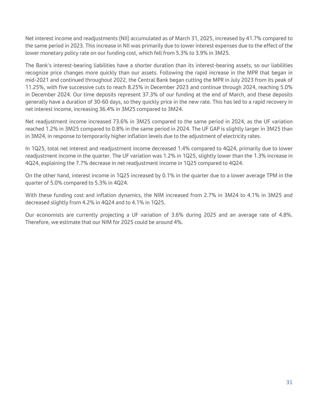 Net interest income and readjustments (NII) accumulated as of March 31, 2025, increased by 41.7% compared to the same period in 2023. This increase in NII was primarily due to lower interest expenses due to the effect of the lower monetary policy rate on our funding cost, which fell from 5.3% to 3.9% in 3M25. The Bank's interest-bearing liabilities have a shorter duration than its interest-bearing assets, so our liabilities recognize price changes more quickly than our assets. Following the rapid increase in the MPR that began in mid-2021 and continued throughout 2022, the Central Bank began cutting the MPR in July 2023 from its peak of 11.25%, with five successive cuts to reach 8.25% in December 2023 and continue through 2024, reaching 5.0% in December 2024. Our time deposits represent 37.3% of our funding at the end of March, and these deposits generally have a duration of 30-60 days, so they quickly price in the new rate. This has led to a rapid recovery in net interest income, increasing 36.4% in 3M25 compared to 3M24. Net readjustment income increased 73.6% in 3M25 compared to the same period in 2024, as the UF variation reached 1.2% in 3M25 compared to 0.8% in the same period in 2024. The UF GAP is slightly larger in 3M25 than in 3M24, in response to temporarily higher inflation levels due to the adjustment of electricity rates. In 1Q25, total net interest and readjustment income decreased 1.4% compared to 4Q24, primarily due to lower readjustment income in the quarter. The UF variation was 1.2% in 1Q25, slightly lower than the 1.3% increase in 4Q24, explaining the 7.7% decrease in net readjustment income in 1Q25 compared to 4Q24. On the other hand, interest income in 1Q25 increased by 0.1% in the quarter due to a lower average TPM in the quarter of 5.0% compared to 5.3% in 4Q24. With these funding cost and inflation dynamics, the NIM increased from 2.7% in 3M24 to 4.1% in 3M25 and decreased slightly from 4.2% in 4Q24 and to 4.1% in 1Q25. Our economists are currently projecting a UF variation of 3.6% during 2025 and an average rate of 4.8%. Therefore, we estimate that our NIM for 2025 could be around 4%. 31