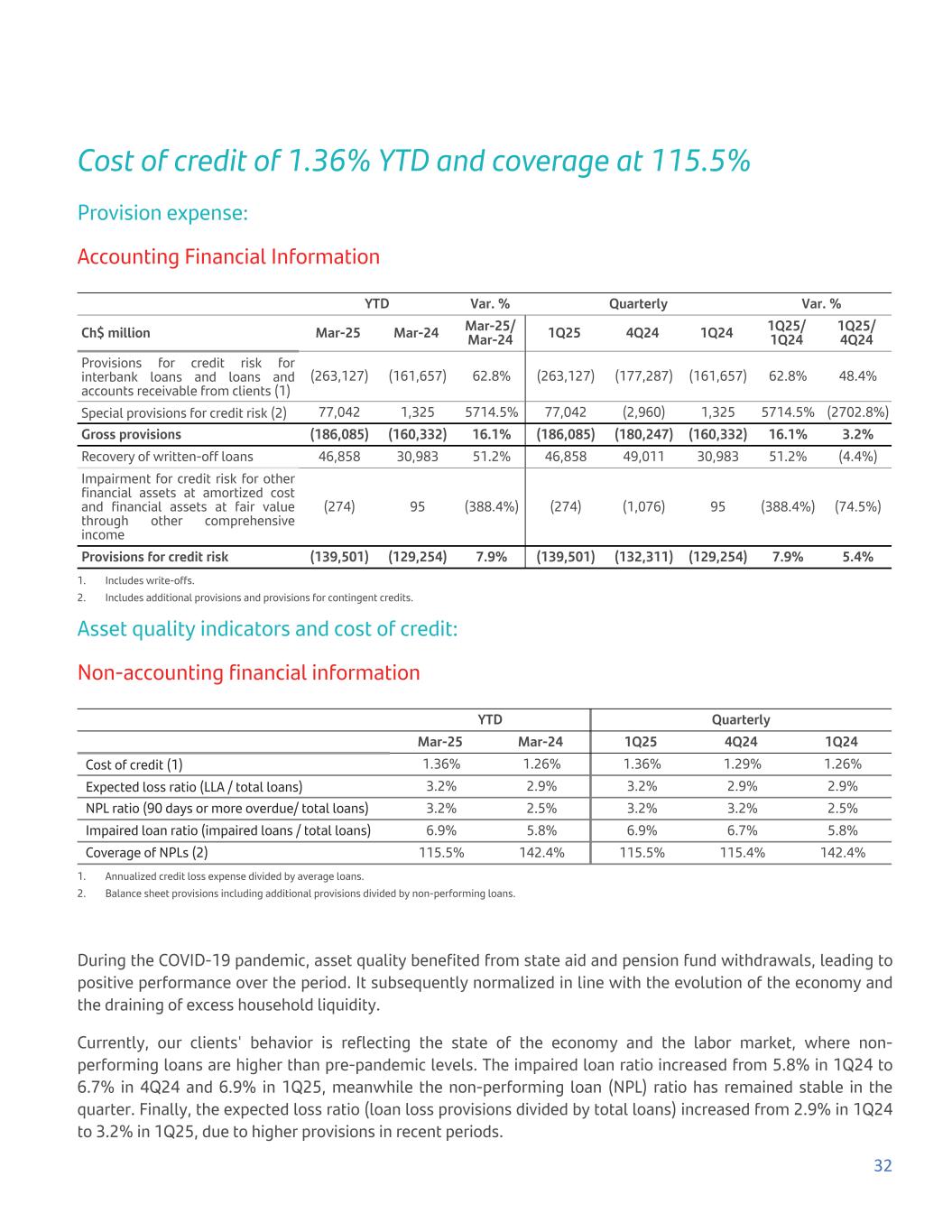Cost of credit of 1.36% YTD and coverage at 115.5% Provision expense: Accounting Financial Information YTD Var. % Quarterly Var. % Ch$ million Mar-25 Mar-24 Mar-25/ Mar-24 1Q25 4Q24 1Q24 1Q25/ 1Q24 1Q25/ 4Q24 Provisions for credit risk for interbank loans and loans and accounts receivable from clients (1) (263,127) (161,657) 62.8% (263,127) (177,287) (161,657) 62.8% 48.4% Special provisions for credit risk (2) 77,042 1,325 5714.5% 77,042 (2,960) 1,325 5714.5% (2702.8%) Gross provisions (186,085) (160,332) 16.1% (186,085) (180,247) (160,332) 16.1% 3.2% Recovery of written-off loans 46,858 30,983 51.2% 46,858 49,011 30,983 51.2% (4.4%) Impairment for credit risk for other financial assets at amortized cost and financial assets at fair value through other comprehensive income (274) 95 (388.4%) (274) (1,076) 95 (388.4%) (74.5%) Provisions for credit risk (139,501) (129,254) 7.9% (139,501) (132,311) (129,254) 7.9% 5.4% 1. Includes write-offs. 2. Includes additional provisions and provisions for contingent credits. Asset quality indicators and cost of credit: Non-accounting financial information YTD Quarterly Mar-25 Mar-24 1Q25 4Q24 1Q24 Cost of credit (1) 1.36% 1.26% 1.36% 1.29% 1.26% Expected loss ratio (LLA / total loans) 3.2% 2.9% 3.2% 2.9% 2.9% NPL ratio (90 days or more overdue/ total loans) 3.2% 2.5% 3.2% 3.2% 2.5% Impaired loan ratio (impaired loans / total loans) 6.9% 5.8% 6.9% 6.7% 5.8% Coverage of NPLs (2) 115.5% 142.4% 115.5% 115.4% 142.4% 1. Annualized credit loss expense divided by average loans. 2. Balance sheet provisions including additional provisions divided by non-performing loans. During the COVID-19 pandemic, asset quality benefited from state aid and pension fund withdrawals, leading to positive performance over the period. It subsequently normalized in line with the evolution of the economy and the draining of excess household liquidity. Currently, our clients' behavior is reflecting the state of the economy and the labor market, where non- performing loans are higher than pre-pandemic levels. The impaired loan ratio increased from 5.8% in 1Q24 to 6.7% in 4Q24 and 6.9% in 1Q25, meanwhile the non-performing loan (NPL) ratio has remained stable in the quarter. Finally, the expected loss ratio (loan loss provisions divided by total loans) increased from 2.9% in 1Q24 to 3.2% in 1Q25, due to higher provisions in recent periods. 32