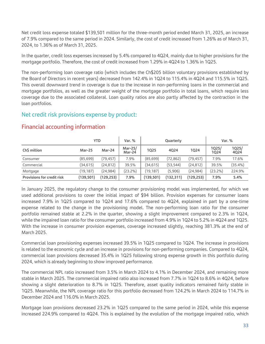 Net credit loss expense totaled $139,501 million for the three-month period ended March 31, 2025, an increase of 7.9% compared to the same period in 2024. Similarly, the cost of credit increased from 1.26% as of March 31, 2024, to 1.36% as of March 31, 2025. In the quarter, credit loss expenses increased by 5.4% compared to 4Q24, mainly due to higher provisions for the mortgage portfolio. Therefore, the cost of credit increased from 1.29% in 4Q24 to 1.36% in 1Q25. The non-performing loan coverage ratio (which includes the Ch$205 billion voluntary provisions established by the Board of Directors in recent years) decreased from 142.4% in 1Q24 to 115.4% in 4Q24 and 115.5% in 1Q25. This overall downward trend in coverage is due to the increase in non-performing loans in the commercial and mortgage portfolios, as well as the greater weight of the mortgage portfolio in total loans, which require less coverage due to the associated collateral. Loan quality ratios are also partly affected by the contraction in the loan portfolios. Net credit risk provisions expense by product: Financial accounting information YTD Var. % Quarterly Var. % Ch$ million Mar-25 Mar-24 Mar-25/ Mar-24 1Q25 4Q24 1Q24 1Q25/ 1Q24 1Q25/ 4Q24 Consumer (85,699) (79,457) 7.9% (85,699) (72,862) (79,457) 7.9% 17.6% Commercial (34,615) (24,812) 39.5% (34,615) (53,544) (24,812) 39.5% (35.4%) Mortgage (19,187) (24,984) (23.2%) (19,187) (5,906) (24,984) (23.2%) 224.9% Provisions for credit risk (139,501) (129,253) 7.9% (139,501) (132,311) (129,253) 7.9% 5.4% In January 2025, the regulatory change to the consumer provisioning model was implemented, for which we used additional provisions to cover the initial impact of $94 billion. Provision expenses for consumer loans increased 7.9% in 1Q25 compared to 1Q24 and 17.6% compared to 4Q24, explained in part by a one-time expense related to the change in the provisioning model. The non-performing loan ratio for the consumer portfolio remained stable at 2.2% in the quarter, showing a slight improvement compared to 2.3% in 1Q24, while the impaired loan ratio for the consumer portfolio increased from 4.9% in 1Q24 to 5.2% in 4Q24 and 1Q25. With the increase in consumer provision expenses, coverage increased slightly, reaching 381.3% at the end of March 2025. Commercial loan provisioning expenses increased 39.5% in 1Q25 compared to 1Q24. The increase in provisions is related to the economic cycle and an increase in provisions for non-performing companies. Compared to 4Q24, commercial loan provisions decreased 35.4% in 1Q25 following strong expense growth in this portfolio during 2024, which is already beginning to show improved performance. The commercial NPL ratio increased from 3.5% in March 2024 to 4.1% in December 2024, and remaining more stable in March 2025. The commercial impaired ratio also increased from 7.7% in 1Q24 to 8.6% in 4Q24, before showing a slight deterioration to 8.7% in 1Q25. Therefore, asset quality indicators remained fairly stable in 1Q25. Meanwhile, the NPL coverage ratio for this portfolio decreased from 124.2% in March 2024 to 114.7% in December 2024 and 116.0% in March 2025. Mortgage loan provisions decreased 23.2% in 1Q25 compared to the same period in 2024, while this expense increased 224.9% compared to 4Q24. This is explained by the evolution of the mortgage impaired ratio, which 33