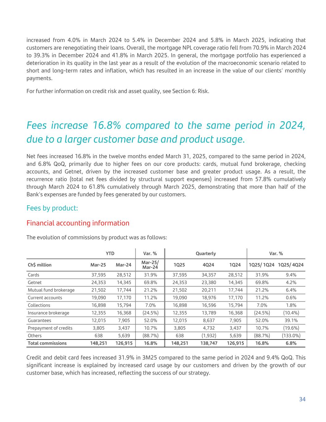 increased from 4.0% in March 2024 to 5.4% in December 2024 and 5.8% in March 2025, indicating that customers are renegotiating their loans. Overall, the mortgage NPL coverage ratio fell from 70.9% in March 2024 to 39.3% in December 2024 and 41.8% in March 2025. In general, the mortgage portfolio has experienced a deterioration in its quality in the last year as a result of the evolution of the macroeconomic scenario related to short and long-term rates and inflation, which has resulted in an increase in the value of our clients' monthly payments. For further information on credit risk and asset quality, see Section 6: Risk. Fees increase 16.8% compared to the same period in 2024, due to a larger customer base and product usage. Net fees increased 16.8% in the twelve months ended March 31, 2025, compared to the same period in 2024, and 6.8% QoQ, primarily due to higher fees on our core products: cards, mutual fund brokerage, checking accounts, and Getnet, driven by the increased customer base and greater product usage. As a result, the recurrence ratio (total net fees divided by structural support expenses) increased from 57.8% cumulatively through March 2024 to 61.8% cumulatively through March 2025, demonstrating that more than half of the Bank's expenses are funded by fees generated by our customers. Fees by product: Financial accounting information The evolution of commissions by product was as follows: YTD Var. % Quarterly Var. % Ch$ million Mar-25 Mar-24 Mar-25/ Mar-24 1Q25 4Q24 1Q24 1Q25/ 1Q24 1Q25/ 4Q24 Cards 37,595 28,512 31.9% 37,595 34,357 28,512 31.9% 9.4% Getnet 24,353 14,345 69.8% 24,353 23,380 14,345 69.8% 4.2% Mutual fund brokerage 21,502 17,744 21.2% 21,502 20,211 17,744 21.2% 6.4% Current accounts 19,090 17,170 11.2% 19,090 18,976 17,170 11.2% 0.6% Collections 16,898 15,794 7.0% 16,898 16,596 15,794 7.0% 1.8% Insurance brokerage 12,355 16,368 (24.5%) 12,355 13,789 16,368 (24.5%) (10.4%) Guarantees 12,015 7,905 52.0% 12,015 8,637 7,905 52.0% 39.1% Prepayment of credits 3,805 3,437 10.7% 3,805 4,732 3,437 10.7% (19.6%) Others 638 5,639 (88.7%) 638 (1,932) 5,639 (88.7%) (133.0%) Total commissions 148,251 126,915 16.8% 148,251 138,747 126,915 16.8% 6.8% Credit and debit card fees increased 31.9% in 3M25 compared to the same period in 2024 and 9.4% QoQ. This significant increase is explained by increased card usage by our customers and driven by the growth of our customer base, which has increased, reflecting the success of our strategy. 34