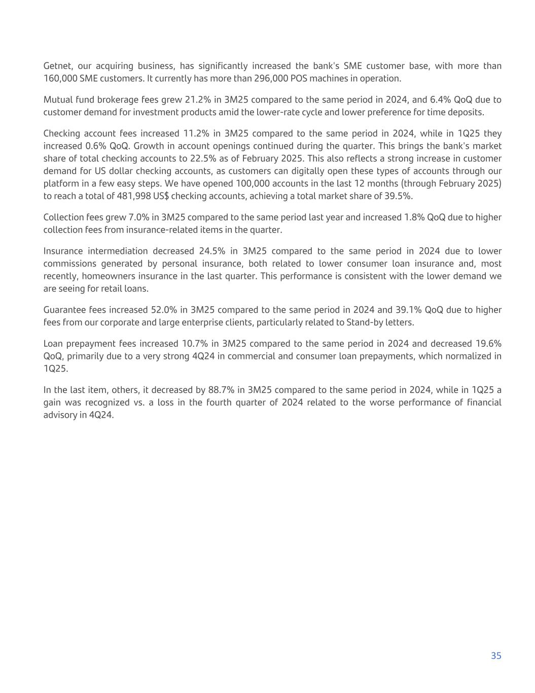 Getnet, our acquiring business, has significantly increased the bank's SME customer base, with more than 160,000 SME customers. It currently has more than 296,000 POS machines in operation. Mutual fund brokerage fees grew 21.2% in 3M25 compared to the same period in 2024, and 6.4% QoQ due to customer demand for investment products amid the lower-rate cycle and lower preference for time deposits. Checking account fees increased 11.2% in 3M25 compared to the same period in 2024, while in 1Q25 they increased 0.6% QoQ. Growth in account openings continued during the quarter. This brings the bank's market share of total checking accounts to 22.5% as of February 2025. This also reflects a strong increase in customer demand for US dollar checking accounts, as customers can digitally open these types of accounts through our platform in a few easy steps. We have opened 100,000 accounts in the last 12 months (through February 2025) to reach a total of 481,998 US$ checking accounts, achieving a total market share of 39.5%. Collection fees grew 7.0% in 3M25 compared to the same period last year and increased 1.8% QoQ due to higher collection fees from insurance-related items in the quarter. Insurance intermediation decreased 24.5% in 3M25 compared to the same period in 2024 due to lower commissions generated by personal insurance, both related to lower consumer loan insurance and, most recently, homeowners insurance in the last quarter. This performance is consistent with the lower demand we are seeing for retail loans. Guarantee fees increased 52.0% in 3M25 compared to the same period in 2024 and 39.1% QoQ due to higher fees from our corporate and large enterprise clients, particularly related to Stand-by letters. Loan prepayment fees increased 10.7% in 3M25 compared to the same period in 2024 and decreased 19.6% QoQ, primarily due to a very strong 4Q24 in commercial and consumer loan prepayments, which normalized in 1Q25. In the last item, others, it decreased by 88.7% in 3M25 compared to the same period in 2024, while in 1Q25 a gain was recognized vs. a loss in the fourth quarter of 2024 related to the worse performance of financial advisory in 4Q24. 35