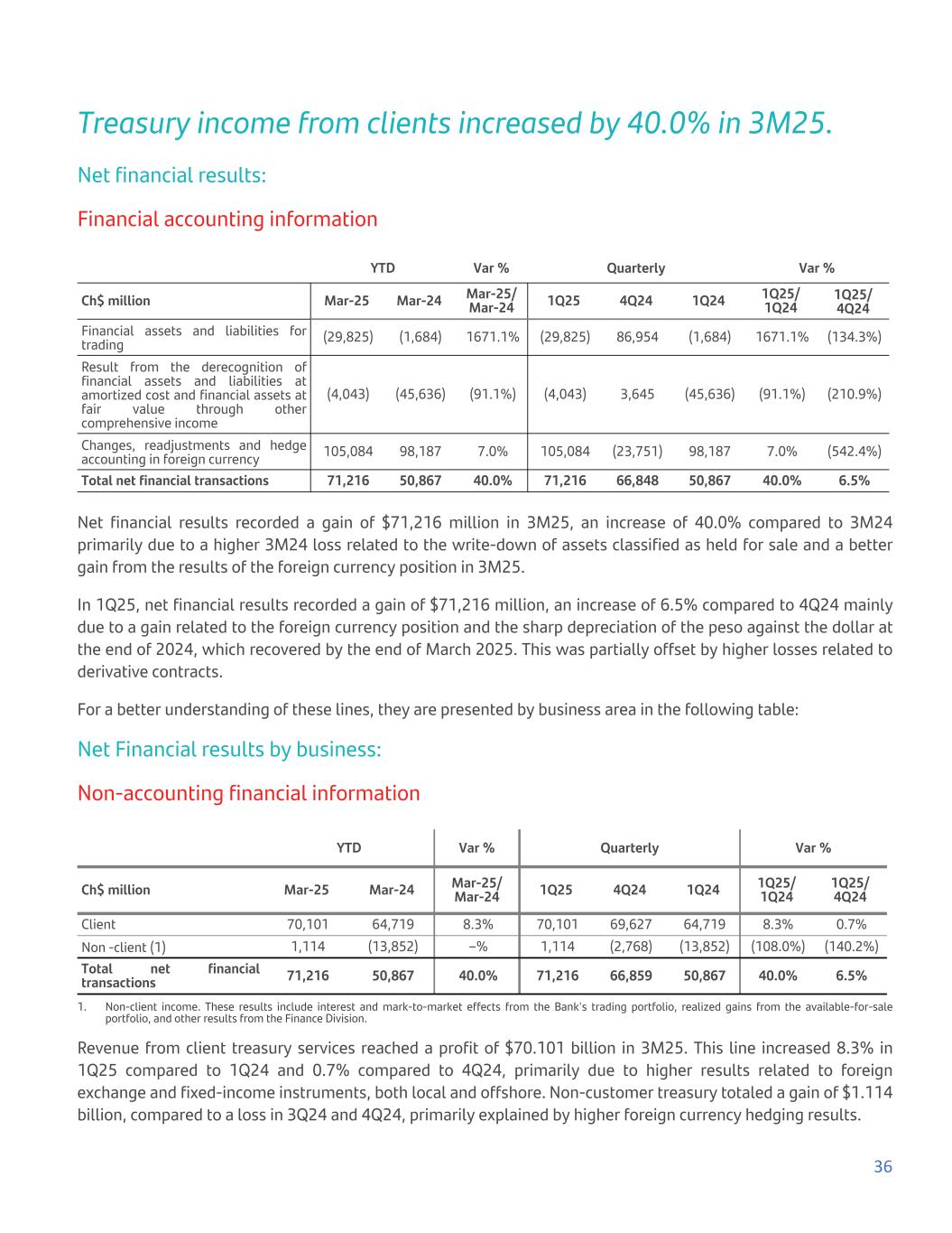 Treasury income from clients increased by 40.0% in 3M25. Net financial results: Financial accounting information YTD Var % Quarterly Var % Ch$ million Mar-25 Mar-24 Mar-25/ Mar-24 1Q25 4Q24 1Q24 1Q25/ 1Q24 1Q25/ 4Q24 Financial assets and liabilities for trading (29,825) (1,684) 1671.1% (29,825) 86,954 (1,684) 1671.1% (134.3%) Result from the derecognition of financial assets and liabilities at amortized cost and financial assets at fair value through other comprehensive income (4,043) (45,636) (91.1%) (4,043) 3,645 (45,636) (91.1%) (210.9%) Changes, readjustments and hedge accounting in foreign currency 105,084 98,187 7.0% 105,084 (23,751) 98,187 7.0% (542.4%) Total net financial transactions 71,216 50,867 40.0% 71,216 66,848 50,867 40.0% 6.5% Net financial results recorded a gain of $71,216 million in 3M25, an increase of 40.0% compared to 3M24 primarily due to a higher 3M24 loss related to the write-down of assets classified as held for sale and a better gain from the results of the foreign currency position in 3M25. In 1Q25, net financial results recorded a gain of $71,216 million, an increase of 6.5% compared to 4Q24 mainly due to a gain related to the foreign currency position and the sharp depreciation of the peso against the dollar at the end of 2024, which recovered by the end of March 2025. This was partially offset by higher losses related to derivative contracts. For a better understanding of these lines, they are presented by business area in the following table: Net Financial results by business: Non-accounting financial information YTD Var % Quarterly Var % Ch$ million Mar-25 Mar-24 Mar-25/ Mar-24 1Q25 4Q24 1Q24 1Q25/ 1Q24 1Q25/ 4Q24 Client 70,101 64,719 8.3% 70,101 69,627 64,719 8.3% 0.7% Non -client (1) 1,114 (13,852) –% 1,114 (2,768) (13,852) (108.0%) (140.2%) Total net financial transactions 71,216 50,867 40.0% 71,216 66,859 50,867 40.0% 6.5% 1. Non-client income. These results include interest and mark-to-market effects from the Bank's trading portfolio, realized gains from the available-for-sale portfolio, and other results from the Finance Division. Revenue from client treasury services reached a profit of $70.101 billion in 3M25. This line increased 8.3% in 1Q25 compared to 1Q24 and 0.7% compared to 4Q24, primarily due to higher results related to foreign exchange and fixed-income instruments, both local and offshore. Non-customer treasury totaled a gain of $1.114 billion, compared to a loss in 3Q24 and 4Q24, primarily explained by higher foreign currency hedging results. 36