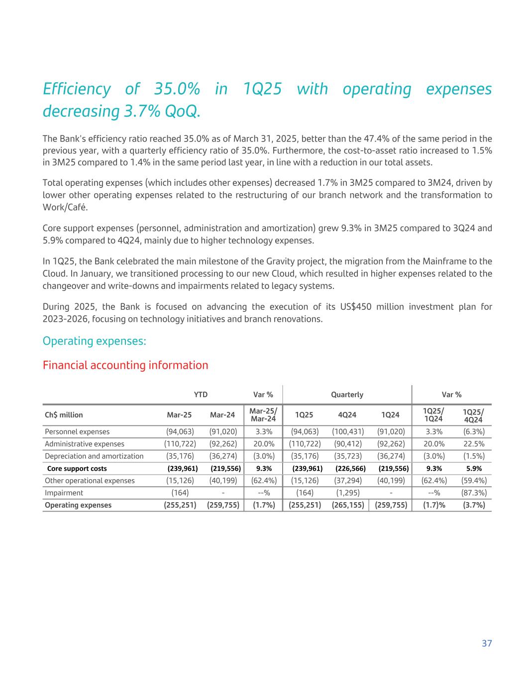 Efficiency of 35.0% in 1Q25 with operating expenses decreasing 3.7% QoQ. The Bank's efficiency ratio reached 35.0% as of March 31, 2025, better than the 47.4% of the same period in the previous year, with a quarterly efficiency ratio of 35.0%. Furthermore, the cost-to-asset ratio increased to 1.5% in 3M25 compared to 1.4% in the same period last year, in line with a reduction in our total assets. Total operating expenses (which includes other expenses) decreased 1.7% in 3M25 compared to 3M24, driven by lower other operating expenses related to the restructuring of our branch network and the transformation to Work/Café. Core support expenses (personnel, administration and amortization) grew 9.3% in 3M25 compared to 3Q24 and 5.9% compared to 4Q24, mainly due to higher technology expenses. In 1Q25, the Bank celebrated the main milestone of the Gravity project, the migration from the Mainframe to the Cloud. In January, we transitioned processing to our new Cloud, which resulted in higher expenses related to the changeover and write-downs and impairments related to legacy systems. During 2025, the Bank is focused on advancing the execution of its US$450 million investment plan for 2023-2026, focusing on technology initiatives and branch renovations. Operating expenses: Financial accounting information YTD Var % Quarterly Var % Ch$ million Mar-25 Mar-24 Mar-25/ Mar-24 1Q25 4Q24 1Q24 1Q25/ 1Q24 1Q25/ 4Q24 Personnel expenses (94,063) (91,020) 3.3% (94,063) (100,431) (91,020) 3.3% (6.3%) Administrative expenses (110,722) (92,262) 20.0% (110,722) (90,412) (92,262) 20.0% 22.5% Depreciation and amortization (35,176) (36,274) (3.0%) (35,176) (35,723) (36,274) (3.0%) (1.5%) Core support costs (239,961) (219,556) 9.3% (239,961) (226,566) (219,556) 9.3% 5.9% Other operational expenses (15,126) (40,199) (62.4%) (15,126) (37,294) (40,199) (62.4%) (59.4%) Impairment (164) - --% (164) (1,295) - --% (87.3%) Operating expenses (255,251) (259,755) (1.7%) (255,251) (265,155) (259,755) (1.7)% (3.7%) 37