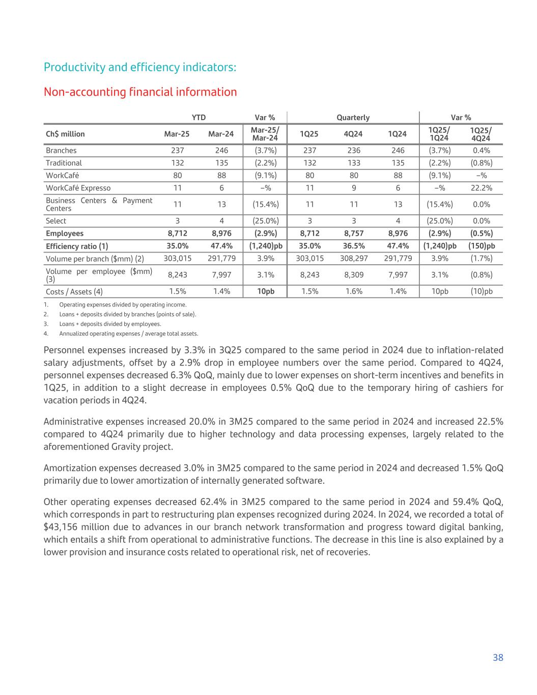 Productivity and efficiency indicators: Non-accounting financial information YTD Var % Quarterly Var % Ch$ million Mar-25 Mar-24 Mar-25/ Mar-24 1Q25 4Q24 1Q24 1Q25/ 1Q24 1Q25/ 4Q24 Branches 237 246 (3.7%) 237 236 246 (3.7%) 0.4% Traditional 132 135 (2.2%) 132 133 135 (2.2%) (0.8%) WorkCafé 80 88 (9.1%) 80 80 88 (9.1%) –% WorkCafé Expresso 11 6 –% 11 9 6 –% 22.2% Business Centers & Payment Centers 11 13 (15.4%) 11 11 13 (15.4%) 0.0% Select 3 4 (25.0%) 3 3 4 (25.0%) 0.0% Employees 8,712 8,976 (2.9%) 8,712 8,757 8,976 (2.9%) (0.5%) Efficiency ratio (1) 35.0% 47.4% (1,240)pb 35.0% 36.5% 47.4% (1,240)pb (150)pb Volume per branch ($mm) (2) 303,015 291,779 3.9% 303,015 308,297 291,779 3.9% (1.7%) Volume per employee ($mm) (3) 8,243 7,997 3.1% 8,243 8,309 7,997 3.1% (0.8%) Costs / Assets (4) 1.5% 1.4% 10pb 1.5% 1.6% 1.4% 10pb (10)pb 1. Operating expenses divided by operating income. 2. Loans + deposits divided by branches (points of sale). 3. Loans + deposits divided by employees. 4. Annualized operating expenses / average total assets. Personnel expenses increased by 3.3% in 3Q25 compared to the same period in 2024 due to inflation-related salary adjustments, offset by a 2.9% drop in employee numbers over the same period. Compared to 4Q24, personnel expenses decreased 6.3% QoQ, mainly due to lower expenses on short-term incentives and benefits in 1Q25, in addition to a slight decrease in employees 0.5% QoQ due to the temporary hiring of cashiers for vacation periods in 4Q24. Administrative expenses increased 20.0% in 3M25 compared to the same period in 2024 and increased 22.5% compared to 4Q24 primarily due to higher technology and data processing expenses, largely related to the aforementioned Gravity project. Amortization expenses decreased 3.0% in 3M25 compared to the same period in 2024 and decreased 1.5% QoQ primarily due to lower amortization of internally generated software. Other operating expenses decreased 62.4% in 3M25 compared to the same period in 2024 and 59.4% QoQ, which corresponds in part to restructuring plan expenses recognized during 2024. In 2024, we recorded a total of $43,156 million due to advances in our branch network transformation and progress toward digital banking, which entails a shift from operational to administrative functions. The decrease in this line is also explained by a lower provision and insurance costs related to operational risk, net of recoveries. 38