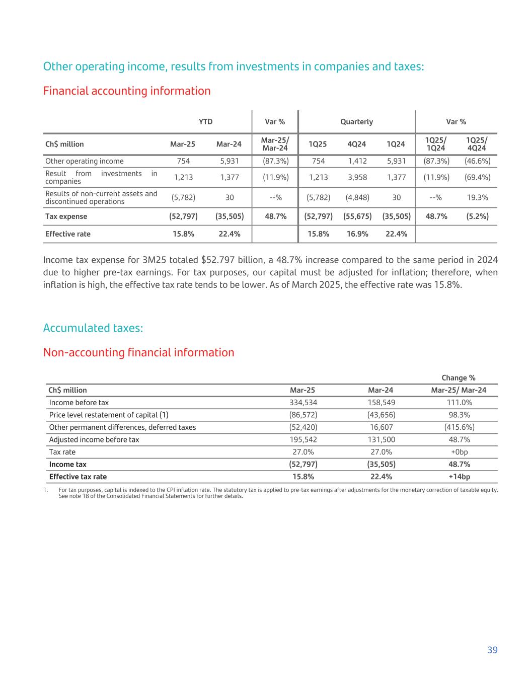 Other operating income, results from investments in companies and taxes: Financial accounting information YTD Var % Quarterly Var % Ch$ million Mar-25 Mar-24 Mar-25/ Mar-24 1Q25 4Q24 1Q24 1Q25/ 1Q24 1Q25/ 4Q24 Other operating income 754 5,931 (87.3%) 754 1,412 5,931 (87.3%) (46.6%) Result from investments in companies 1,213 1,377 (11.9%) 1,213 3,958 1,377 (11.9%) (69.4%) Results of non-current assets and discontinued operations (5,782) 30 --% (5,782) (4,848) 30 --% 19.3% Tax expense (52,797) (35,505) 48.7% (52,797) (55,675) (35,505) 48.7% (5.2%) Effective rate 15.8% 22.4% 15.8% 16.9% 22.4% Income tax expense for 3M25 totaled $52.797 billion, a 48.7% increase compared to the same period in 2024 due to higher pre-tax earnings. For tax purposes, our capital must be adjusted for inflation; therefore, when inflation is high, the effective tax rate tends to be lower. As of March 2025, the effective rate was 15.8%. Accumulated taxes: Non-accounting financial information Change % Ch$ million Mar-25 Mar-24 Mar-25/ Mar-24 Income before tax 334,534 158,549 111.0% Price level restatement of capital (1) (86,572) (43,656) 98.3% Other permanent differences, deferred taxes (52,420) 16,607 (415.6%) Adjusted income before tax 195,542 131,500 48.7% Tax rate 27.0% 27.0% +0bp Income tax (52,797) (35,505) 48.7% Effective tax rate 15.8% 22.4% +14bp 1. For tax purposes, capital is indexed to the CPI inflation rate. The statutory tax is applied to pre-tax earnings after adjustments for the monetary correction of taxable equity. See note 18 of the Consolidated Financial Statements for further details. 39