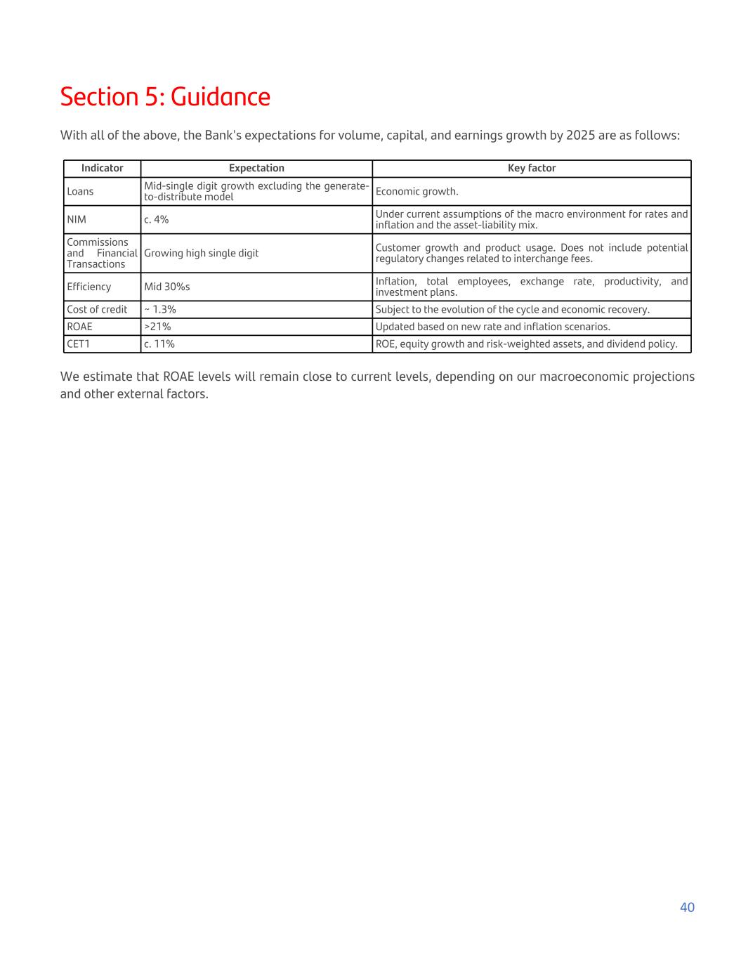 Section 5: Guidance With all of the above, the Bank's expectations for volume, capital, and earnings growth by 2025 are as follows: Indicator Expectation Key factor Loans Mid-single digit growth excluding the generate- to-distribute model Economic growth. NIM c. 4% Under current assumptions of the macro environment for rates and inflation and the asset-liability mix. Commissions and Financial Transactions Growing high single digit Customer growth and product usage. Does not include potential regulatory changes related to interchange fees. Efficiency Mid 30%s Inflation, total employees, exchange rate, productivity, and investment plans. Cost of credit ~ 1.3% Subject to the evolution of the cycle and economic recovery. ROAE >21% Updated based on new rate and inflation scenarios. CET1 c. 11% ROE, equity growth and risk-weighted assets, and dividend policy. We estimate that ROAE levels will remain close to current levels, depending on our macroeconomic projections and other external factors. 40