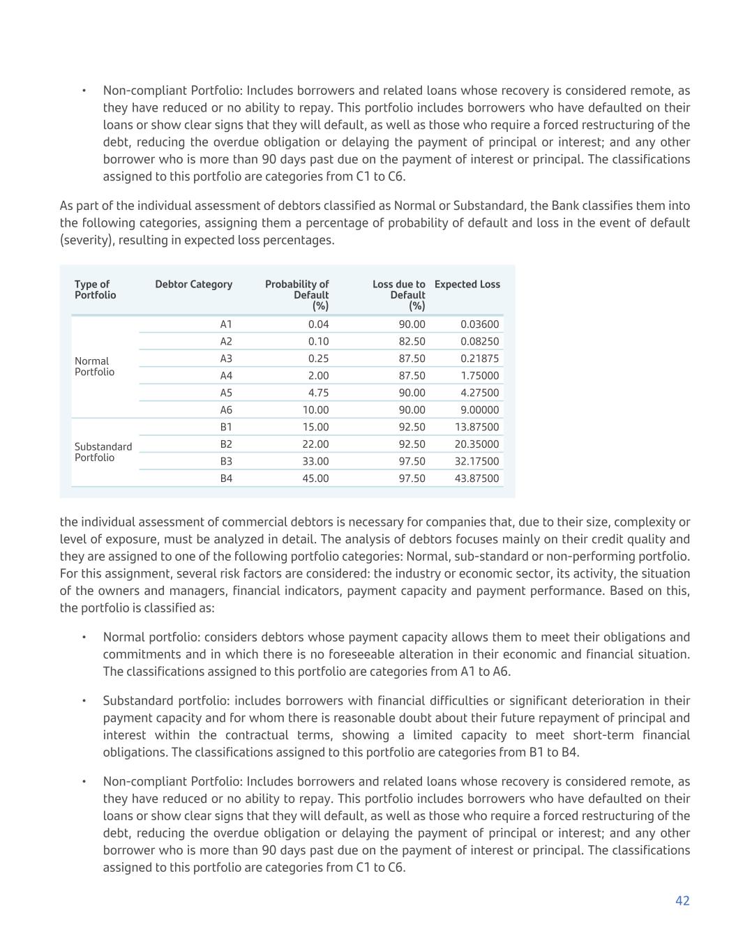 • Non-compliant Portfolio: Includes borrowers and related loans whose recovery is considered remote, as they have reduced or no ability to repay. This portfolio includes borrowers who have defaulted on their loans or show clear signs that they will default, as well as those who require a forced restructuring of the debt, reducing the overdue obligation or delaying the payment of principal or interest; and any other borrower who is more than 90 days past due on the payment of interest or principal. The classifications assigned to this portfolio are categories from C1 to C6. As part of the individual assessment of debtors classified as Normal or Substandard, the Bank classifies them into the following categories, assigning them a percentage of probability of default and loss in the event of default (severity), resulting in expected loss percentages. Type of Portfolio Debtor Category Probability of Default (%) Loss due to Default (%) Expected Loss Normal Portfolio A1 0.04 90.00 0.03600 A2 0.10 82.50 0.08250 A3 0.25 87.50 0.21875 A4 2.00 87.50 1.75000 A5 4.75 90.00 4.27500 A6 10.00 90.00 9.00000 Substandard Portfolio B1 15.00 92.50 13.87500 B2 22.00 92.50 20.35000 B3 33.00 97.50 32.17500 B4 45.00 97.50 43.87500 the individual assessment of commercial debtors is necessary for companies that, due to their size, complexity or level of exposure, must be analyzed in detail. The analysis of debtors focuses mainly on their credit quality and they are assigned to one of the following portfolio categories: Normal, sub-standard or non-performing portfolio. For this assignment, several risk factors are considered: the industry or economic sector, its activity, the situation of the owners and managers, financial indicators, payment capacity and payment performance. Based on this, the portfolio is classified as: • Normal portfolio: considers debtors whose payment capacity allows them to meet their obligations and commitments and in which there is no foreseeable alteration in their economic and financial situation. The classifications assigned to this portfolio are categories from A1 to A6. • Substandard portfolio: includes borrowers with financial difficulties or significant deterioration in their payment capacity and for whom there is reasonable doubt about their future repayment of principal and interest within the contractual terms, showing a limited capacity to meet short-term financial obligations. The classifications assigned to this portfolio are categories from B1 to B4. • Non-compliant Portfolio: Includes borrowers and related loans whose recovery is considered remote, as they have reduced or no ability to repay. This portfolio includes borrowers who have defaulted on their loans or show clear signs that they will default, as well as those who require a forced restructuring of the debt, reducing the overdue obligation or delaying the payment of principal or interest; and any other borrower who is more than 90 days past due on the payment of interest or principal. The classifications assigned to this portfolio are categories from C1 to C6. 42