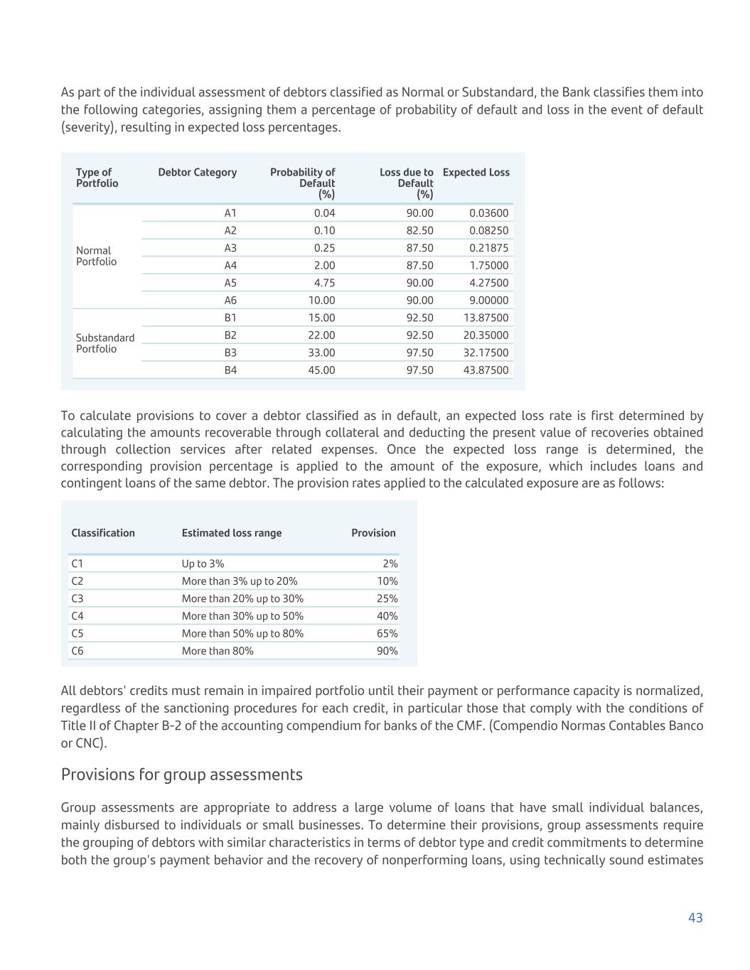 As part of the individual assessment of debtors classified as Normal or Substandard, the Bank classifies them into the following categories, assigning them a percentage of probability of default and loss in the event of default (severity), resulting in expected loss percentages. Type of Portfolio Debtor Category Probability of Default (%) Loss due to Default (%) Expected Loss Normal Portfolio A1 0.04 90.00 0.03600 A2 0.10 82.50 0.08250 A3 0.25 87.50 0.21875 A4 2.00 87.50 1.75000 A5 4.75 90.00 4.27500 A6 10.00 90.00 9.00000 Substandard Portfolio B1 15.00 92.50 13.87500 B2 22.00 92.50 20.35000 B3 33.00 97.50 32.17500 B4 45.00 97.50 43.87500 To calculate provisions to cover a debtor classified as in default, an expected loss rate is first determined by calculating the amounts recoverable through collateral and deducting the present value of recoveries obtained through collection services after related expenses. Once the expected loss range is determined, the corresponding provision percentage is applied to the amount of the exposure, which includes loans and contingent loans of the same debtor. The provision rates applied to the calculated exposure are as follows: Classification Estimated loss range Provision C1 Up to 3% 2% C2 More than 3% up to 20% 10% C3 More than 20% up to 30% 25% C4 More than 30% up to 50% 40% C5 More than 50% up to 80% 65% C6 More than 80% 90% All debtors' credits must remain in impaired portfolio until their payment or performance capacity is normalized, regardless of the sanctioning procedures for each credit, in particular those that comply with the conditions of Title II of Chapter B-2 of the accounting compendium for banks of the CMF. (Compendio Normas Contables Banco or CNC). Provisions for group assessments Group assessments are appropriate to address a large volume of loans that have small individual balances, mainly disbursed to individuals or small businesses. To determine their provisions, group assessments require the grouping of debtors with similar characteristics in terms of debtor type and credit commitments to determine both the group's payment behavior and the recovery of nonperforming loans, using technically sound estimates 43