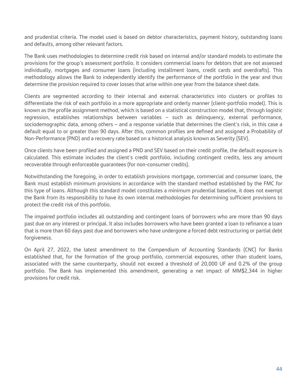 and prudential criteria. The model used is based on debtor characteristics, payment history, outstanding loans and defaults, among other relevant factors. The Bank uses methodologies to determine credit risk based on internal and/or standard models to estimate the provisions for the group's assessment portfolio. It considers commercial loans for debtors that are not assessed individually, mortgages and consumer loans (including installment loans, credit cards and overdrafts). This methodology allows the Bank to independently identify the performance of the portfolio in the year and thus determine the provision required to cover losses that arise within one year from the balance sheet date. Clients are segmented according to their internal and external characteristics into clusters or profiles to differentiate the risk of each portfolio in a more appropriate and orderly manner (client-portfolio model). This is known as the profile assignment method, which is based on a statistical construction model that, through logistic regression, establishes relationships between variables – such as delinquency, external performance, sociodemographic data, among others – and a response variable that determines the client's risk, in this case a default equal to or greater than 90 days. After this, common profiles are defined and assigned a Probability of Non-Performance (PND) and a recovery rate based on a historical analysis known as Severity (SEV). Once clients have been profiled and assigned a PND and SEV based on their credit profile, the default exposure is calculated. This estimate includes the client's credit portfolio, including contingent credits, less any amount recoverable through enforceable guarantees (for non-consumer credits). Notwithstanding the foregoing, in order to establish provisions mortgage, commercial and consumer loans, the Bank must establish minimum provisions in accordance with the standard method established by the FMC for this type of loans. Although this standard model constitutes a minimum prudential baseline, it does not exempt the Bank from its responsibility to have its own internal methodologies for determining sufficient provisions to protect the credit risk of this portfolio. The impaired portfolio includes all outstanding and contingent loans of borrowers who are more than 90 days past due on any interest or principal. It also includes borrowers who have been granted a loan to refinance a loan that is more than 60 days past due and borrowers who have undergone a forced debt restructuring or partial debt forgiveness. On April 27, 2022, the latest amendment to the Compendium of Accounting Standards (CNC) for Banks established that, for the formation of the group portfolio, commercial exposures, other than student loans, associated with the same counterparty, should not exceed a threshold of 20,000 UF and 0.2% of the group portfolio. The Bank has implemented this amendment, generating a net impact of MM$2,344 in higher provisions for credit risk. 44
