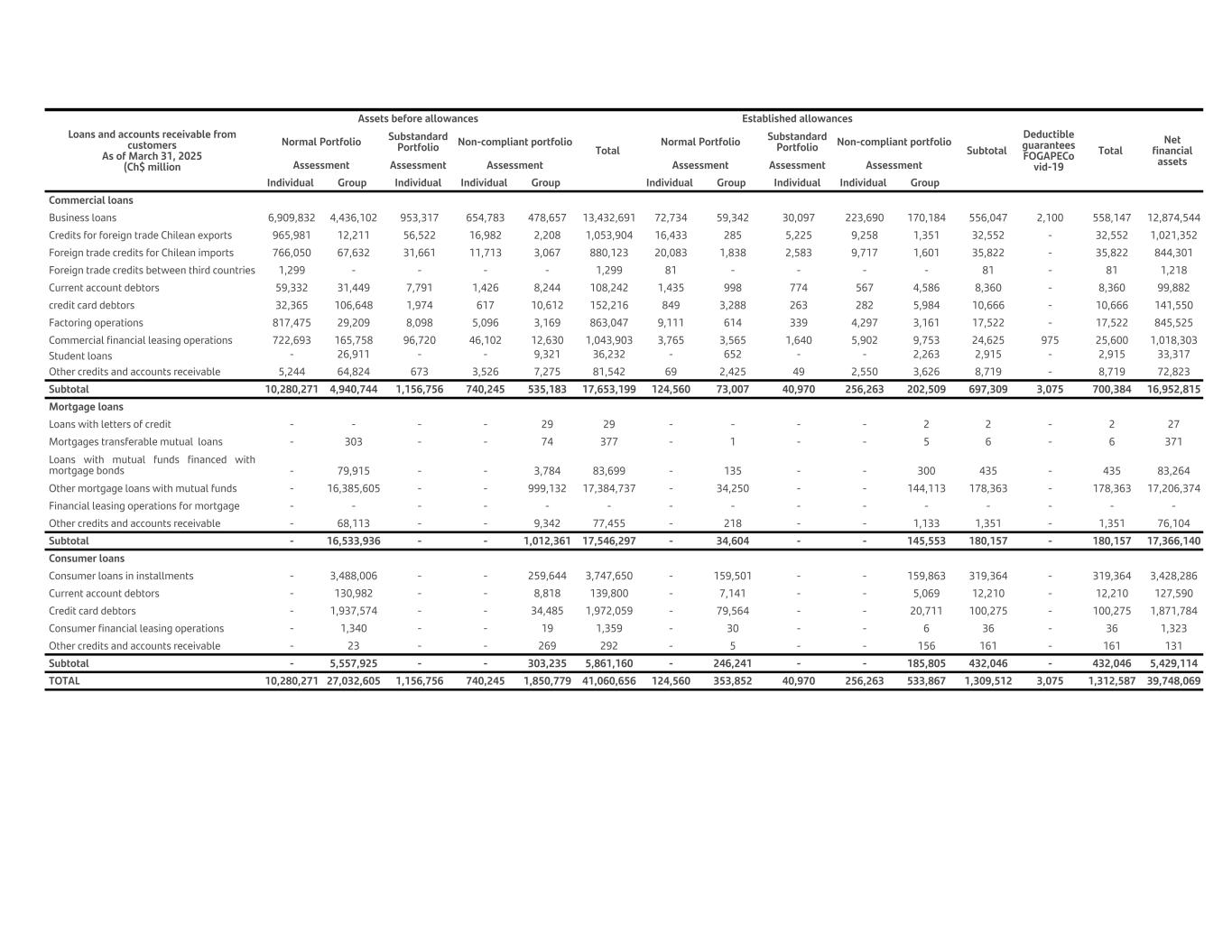 Loans and accounts receivable from customers As of March 31, 2025 (Ch$ million Assets before allowances Total Established allowances Subtotal Deductible guarantees FOGAPECo vid-19 Total Net financial assets Normal Portfolio Substandard Portfolio Non-compliant portfolio Normal Portfolio Substandard Portfolio Non-compliant portfolio Assessment Assessment Assessment Assessment Assessment Assessment Individual Group Individual Individual Group Individual Group Individual Individual Group Commercial loans Business loans 6,909,832 4,436,102 953,317 654,783 478,657 13,432,691 72,734 59,342 30,097 223,690 170,184 556,047 2,100 558,147 12,874,544 Credits for foreign trade Chilean exports 965,981 12,211 56,522 16,982 2,208 1,053,904 16,433 285 5,225 9,258 1,351 32,552 - 32,552 1,021,352 Foreign trade credits for Chilean imports 766,050 67,632 31,661 11,713 3,067 880,123 20,083 1,838 2,583 9,717 1,601 35,822 - 35,822 844,301 Foreign trade credits between third countries 1,299 - - - - 1,299 81 - - - - 81 - 81 1,218 Current account debtors 59,332 31,449 7,791 1,426 8,244 108,242 1,435 998 774 567 4,586 8,360 - 8,360 99,882 credit card debtors 32,365 106,648 1,974 617 10,612 152,216 849 3,288 263 282 5,984 10,666 - 10,666 141,550 Factoring operations 817,475 29,209 8,098 5,096 3,169 863,047 9,111 614 339 4,297 3,161 17,522 - 17,522 845,525 Commercial financial leasing operations 722,693 165,758 96,720 46,102 12,630 1,043,903 3,765 3,565 1,640 5,902 9,753 24,625 975 25,600 1,018,303 Student loans - 26,911 - - 9,321 36,232 - 652 - - 2,263 2,915 - 2,915 33,317 Other credits and accounts receivable 5,244 64,824 673 3,526 7,275 81,542 69 2,425 49 2,550 3,626 8,719 - 8,719 72,823 Subtotal 10,280,271 4,940,744 1,156,756 740,245 535,183 17,653,199 124,560 73,007 40,970 256,263 202,509 697,309 3,075 700,384 16,952,815 Mortgage loans Loans with letters of credit - - - - 29 29 - - - - 2 2 - 2 27 Mortgages transferable mutual loans - 303 - - 74 377 - 1 - - 5 6 - 6 371 Loans with mutual funds financed with mortgage bonds - 79,915 - - 3,784 83,699 - 135 - - 300 435 - 435 83,264 Other mortgage loans with mutual funds - 16,385,605 - - 999,132 17,384,737 - 34,250 - - 144,113 178,363 - 178,363 17,206,374 Financial leasing operations for mortgage - - - - - - - - - - - - - - - Other credits and accounts receivable - 68,113 - - 9,342 77,455 - 218 - - 1,133 1,351 - 1,351 76,104 Subtotal - 16,533,936 - - 1,012,361 17,546,297 - 34,604 - - 145,553 180,157 - 180,157 17,366,140 Consumer loans Consumer loans in installments - 3,488,006 - - 259,644 3,747,650 - 159,501 - - 159,863 319,364 - 319,364 3,428,286 Current account debtors - 130,982 - - 8,818 139,800 - 7,141 - - 5,069 12,210 - 12,210 127,590 Credit card debtors - 1,937,574 - - 34,485 1,972,059 - 79,564 - - 20,711 100,275 - 100,275 1,871,784 Consumer financial leasing operations - 1,340 - - 19 1,359 - 30 - - 6 36 - 36 1,323 Other credits and accounts receivable - 23 - - 269 292 - 5 - - 156 161 - 161 131 Subtotal - 5,557,925 - - 303,235 5,861,160 - 246,241 - - 185,805 432,046 - 432,046 5,429,114 TOTAL 10,280,271 27,032,605 1,156,756 740,245 1,850,779 41,060,656 124,560 353,852 40,970 256,263 533,867 1,309,512 3,075 1,312,587 39,748,069