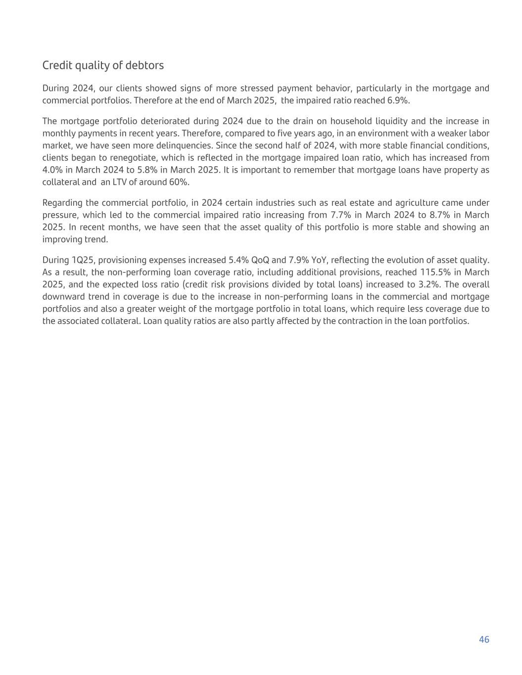 Credit quality of debtors During 2024, our clients showed signs of more stressed payment behavior, particularly in the mortgage and commercial portfolios. Therefore at the end of March 2025, the impaired ratio reached 6.9%. The mortgage portfolio deteriorated during 2024 due to the drain on household liquidity and the increase in monthly payments in recent years. Therefore, compared to five years ago, in an environment with a weaker labor market, we have seen more delinquencies. Since the second half of 2024, with more stable financial conditions, clients began to renegotiate, which is reflected in the mortgage impaired loan ratio, which has increased from 4.0% in March 2024 to 5.8% in March 2025. It is important to remember that mortgage loans have property as collateral and an LTV of around 60%. Regarding the commercial portfolio, in 2024 certain industries such as real estate and agriculture came under pressure, which led to the commercial impaired ratio increasing from 7.7% in March 2024 to 8.7% in March 2025. In recent months, we have seen that the asset quality of this portfolio is more stable and showing an improving trend. During 1Q25, provisioning expenses increased 5.4% QoQ and 7.9% YoY, reflecting the evolution of asset quality. As a result, the non-performing loan coverage ratio, including additional provisions, reached 115.5% in March 2025, and the expected loss ratio (credit risk provisions divided by total loans) increased to 3.2%. The overall downward trend in coverage is due to the increase in non-performing loans in the commercial and mortgage portfolios and also a greater weight of the mortgage portfolio in total loans, which require less coverage due to the associated collateral. Loan quality ratios are also partly affected by the contraction in the loan portfolios. 46