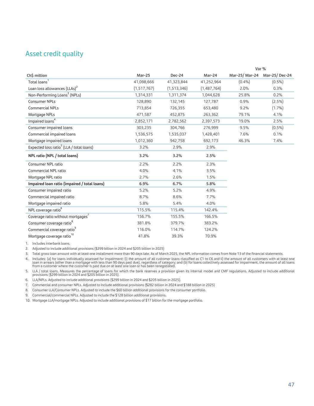 Asset credit quality Var % Ch$ million Mar-25 Dec-24 Mar-24 Mar-25/ Mar-24 Mar-25/ Dec-24 Total loans1 41,098,666 41,323,844 41,252,964 (0.4%) (0.5%) Loan loss allowances (LLAs)2 (1,517,767) (1,513,346) (1,487,764) 2.0% 0.3% Non-Performing Loans3 (NPLs) 1,314,331 1,311,374 1,044,628 25.8% 0.2% Consumer NPLs 128,890 132,145 127,787 0.9% (2.5%) Commercial NPLs 713,854 726,355 653,480 9.2% (1.7%) Mortgage NPLs 471,587 452,875 263,362 79.1% 4.1% Impaired loans4 2,852,171 2,782,562 2,397,573 19.0% 2.5% Consumer impaired loans 303,235 304,766 276,999 9.5% (0.5%) Commercial impaired loans 1,536,575 1,535,037 1,428,401 7.6% 0.1% Mortgage impaired loans 1,012,360 942,758 692,173 46.3% 7.4% Expected loss ratio5 (LLA / total loans) 3.2% 2.9% 2.9% NPL ratio (NPL / total loans) 3.2% 3.2% 2.5% Consumer NPL ratio 2.2% 2.2% 2.3% Commercial NPL ratio 4.0% 4.1% 3.5% Mortgage NPL ratio 2.7% 2.6% 1.5% Impaired loan ratio (impaired / total loans) 6.9% 6.7% 5.8% Consumer impaired ratio 5.2% 5.2% 4.9% Commercial impaired ratio 8.7% 8.6% 7.7% Mortgage impaired ratio 5.8% 5.4% 4.0% NPL coverage ratio6 115.5% 115.4% 142.4% Coverage ratio without mortgages7 156.7% 155.5% 166.5% Consumer coverage ratio8 381.8% 379.7% 383.2% Commercial coverage ratio9 116.0% 114.7% 124.2% Mortgage coverage ratio10 41.8% 39.3% 70.9% 1. Includes interbank loans. 2. Adjusted to include additional provisions ($299 billion in 2024 and $205 billion in 2025) 3. Total gross loan amount with at least one installment more than 90 days late. As of March 2025, the NPL information comes from Note 13 of the financial statements. 4.. Includes: (a) for loans individually assessed for impairment: (i) the amount of all customer loans classified as C1 to C6 and ii) the amount of all customers with at least one loan in arrears (other than a mortgage with less than 90 days past due), regardless of category; and (b) for loans collectively assessed for impairment, the amount of all loans from a customer where the customer is past due on at least one loan or has been renegotiated. 5. LLA / total loans. Measures the percentage of loans for which the bank reserves a provision given its internal model and CMF regulations. Adjusted to include additional provisions ($299 billion in 2024 and $205 billion in 2025). 6. LLA/NPLs. Adjusted to include additional provisions ($299 billion in 2024 and $205 billion in 2025). 7. Commercial and consumer NPLs. Adjusted to include additional provisions ($282 billion in 2024 and $188 billion in 2025) 8. Consumer LLA/Consumer NPLs. Adjusted to include the $60 billion additional provisions for the consumer portfolio. 9. Commercial/commercial NPLs. Adjusted to include the $128 billion additional provisions. 10. Mortgage LLA/mortgage NPLs. Adjusted to include additional provisions of $17 billion for the mortgage portfolio. 47