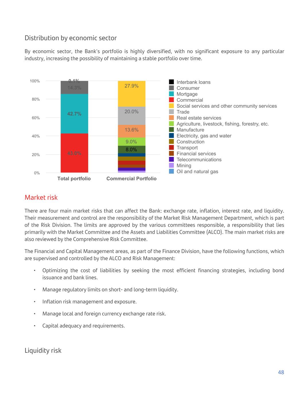 Distribution by economic sector By economic sector, the Bank's portfolio is highly diversified, with no significant exposure to any particular industry, increasing the possibility of maintaining a stable portfolio over time. 8.0% 9.0% 13.6% 20.0% 27.9% 43.0% 42.7% 14.3% 0.1% Interbank loans Consumer Mortgage Commercial Social services and other community services Trade Real estate services Agriculture, livestock, fishing, forestry, etc. Manufacture Electricity, gas and water Construction Transport Financial services Telecommunications Mining Oil and natural gas Total portfolio Commercial Portfolio 0% 20% 40% 60% 80% 100% Market risk There are four main market risks that can affect the Bank: exchange rate, inflation, interest rate, and liquidity. Their measurement and control are the responsibility of the Market Risk Management Department, which is part of the Risk Division. The limits are approved by the various committees responsible, a responsibility that lies primarily with the Market Committee and the Assets and Liabilities Committee (ALCO). The main market risks are also reviewed by the Comprehensive Risk Committee. The Financial and Capital Management areas, as part of the Finance Division, have the following functions, which are supervised and controlled by the ALCO and Risk Management: • Optimizing the cost of liabilities by seeking the most efficient financing strategies, including bond issuance and bank lines. • Manage regulatory limits on short- and long-term liquidity. • Inflation risk management and exposure. • Manage local and foreign currency exchange rate risk. • Capital adequacy and requirements. Liquidity risk 48