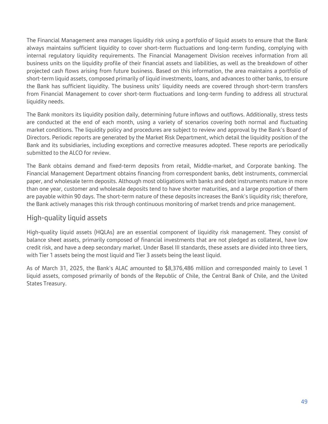 The Financial Management area manages liquidity risk using a portfolio of liquid assets to ensure that the Bank always maintains sufficient liquidity to cover short-term fluctuations and long-term funding, complying with internal regulatory liquidity requirements. The Financial Management Division receives information from all business units on the liquidity profile of their financial assets and liabilities, as well as the breakdown of other projected cash flows arising from future business. Based on this information, the area maintains a portfolio of short-term liquid assets, composed primarily of liquid investments, loans, and advances to other banks, to ensure the Bank has sufficient liquidity. The business units' liquidity needs are covered through short-term transfers from Financial Management to cover short-term fluctuations and long-term funding to address all structural liquidity needs. The Bank monitors its liquidity position daily, determining future inflows and outflows. Additionally, stress tests are conducted at the end of each month, using a variety of scenarios covering both normal and fluctuating market conditions. The liquidity policy and procedures are subject to review and approval by the Bank's Board of Directors. Periodic reports are generated by the Market Risk Department, which detail the liquidity position of the Bank and its subsidiaries, including exceptions and corrective measures adopted. These reports are periodically submitted to the ALCO for review. The Bank obtains demand and fixed-term deposits from retail, Middle-market, and Corporate banking. The Financial Management Department obtains financing from correspondent banks, debt instruments, commercial paper, and wholesale term deposits. Although most obligations with banks and debt instruments mature in more than one year, customer and wholesale deposits tend to have shorter maturities, and a large proportion of them are payable within 90 days. The short-term nature of these deposits increases the Bank's liquidity risk; therefore, the Bank actively manages this risk through continuous monitoring of market trends and price management. High-quality liquid assets High-quality liquid assets (HQLAs) are an essential component of liquidity risk management. They consist of balance sheet assets, primarily composed of financial investments that are not pledged as collateral, have low credit risk, and have a deep secondary market. Under Basel III standards, these assets are divided into three tiers, with Tier 1 assets being the most liquid and Tier 3 assets being the least liquid. As of March 31, 2025, the Bank's ALAC amounted to $8,376,486 million and corresponded mainly to Level 1 liquid assets, composed primarily of bonds of the Republic of Chile, the Central Bank of Chile, and the United States Treasury. 49