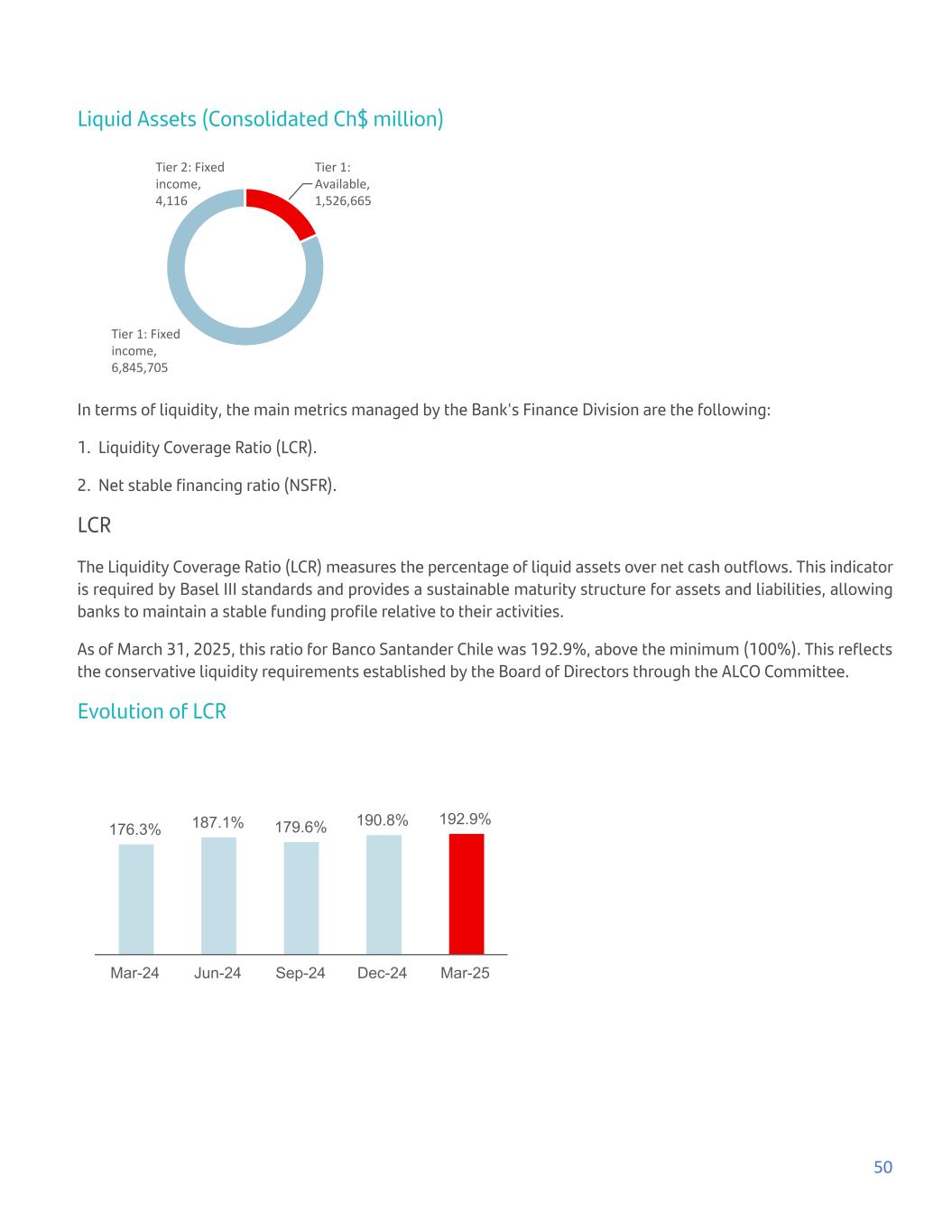 Liquid Assets (Consolidated Ch$ million) Tier 1: Available, 1,526,665 Tier 1: Fixed income, 6,845,705 Tier 2: Fixed income, 4,116 In terms of liquidity, the main metrics managed by the Bank's Finance Division are the following: 1. Liquidity Coverage Ratio (LCR). 2. Net stable financing ratio (NSFR). LCR The Liquidity Coverage Ratio (LCR) measures the percentage of liquid assets over net cash outflows. This indicator is required by Basel III standards and provides a sustainable maturity structure for assets and liabilities, allowing banks to maintain a stable funding profile relative to their activities. As of March 31, 2025, this ratio for Banco Santander Chile was 192.9%, above the minimum (100%). This reflects the conservative liquidity requirements established by the Board of Directors through the ALCO Committee. Evolution of LCR 176.3% 187.1% 179.6% 190.8% 192.9% Mar-24 Jun-24 Sep-24 Dec-24 Mar-25 50