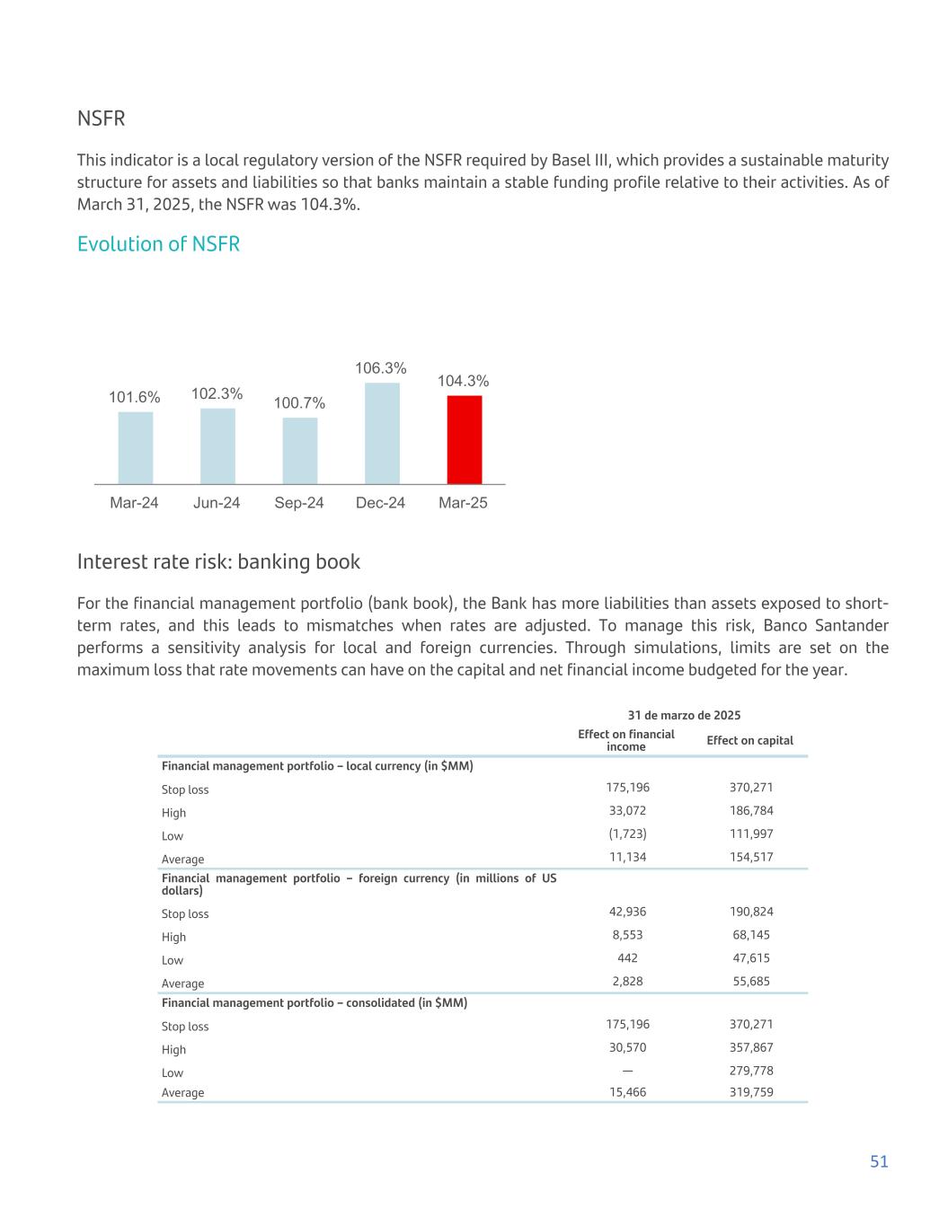 NSFR This indicator is a local regulatory version of the NSFR required by Basel III, which provides a sustainable maturity structure for assets and liabilities so that banks maintain a stable funding profile relative to their activities. As of March 31, 2025, the NSFR was 104.3%. Evolution of NSFR 101.6% 102.3% 100.7% 106.3% 104.3% Mar-24 Jun-24 Sep-24 Dec-24 Mar-25 Interest rate risk: banking book For the financial management portfolio (bank book), the Bank has more liabilities than assets exposed to short- term rates, and this leads to mismatches when rates are adjusted. To manage this risk, Banco Santander performs a sensitivity analysis for local and foreign currencies. Through simulations, limits are set on the maximum loss that rate movements can have on the capital and net financial income budgeted for the year. 31 de marzo de 2025 Effect on financial income Effect on capital Financial management portfolio – local currency (in $MM) Stop loss 175,196 370,271 High 33,072 186,784 Low (1,723) 111,997 Average 11,134 154,517 Financial management portfolio – foreign currency (in millions of US dollars) Stop loss 42,936 190,824 High 8,553 68,145 Low 442 47,615 Average 2,828 55,685 Financial management portfolio – consolidated (in $MM) Stop loss 175,196 370,271 High 30,570 357,867 Low — 279,778 Average 15,466 319,759 51
