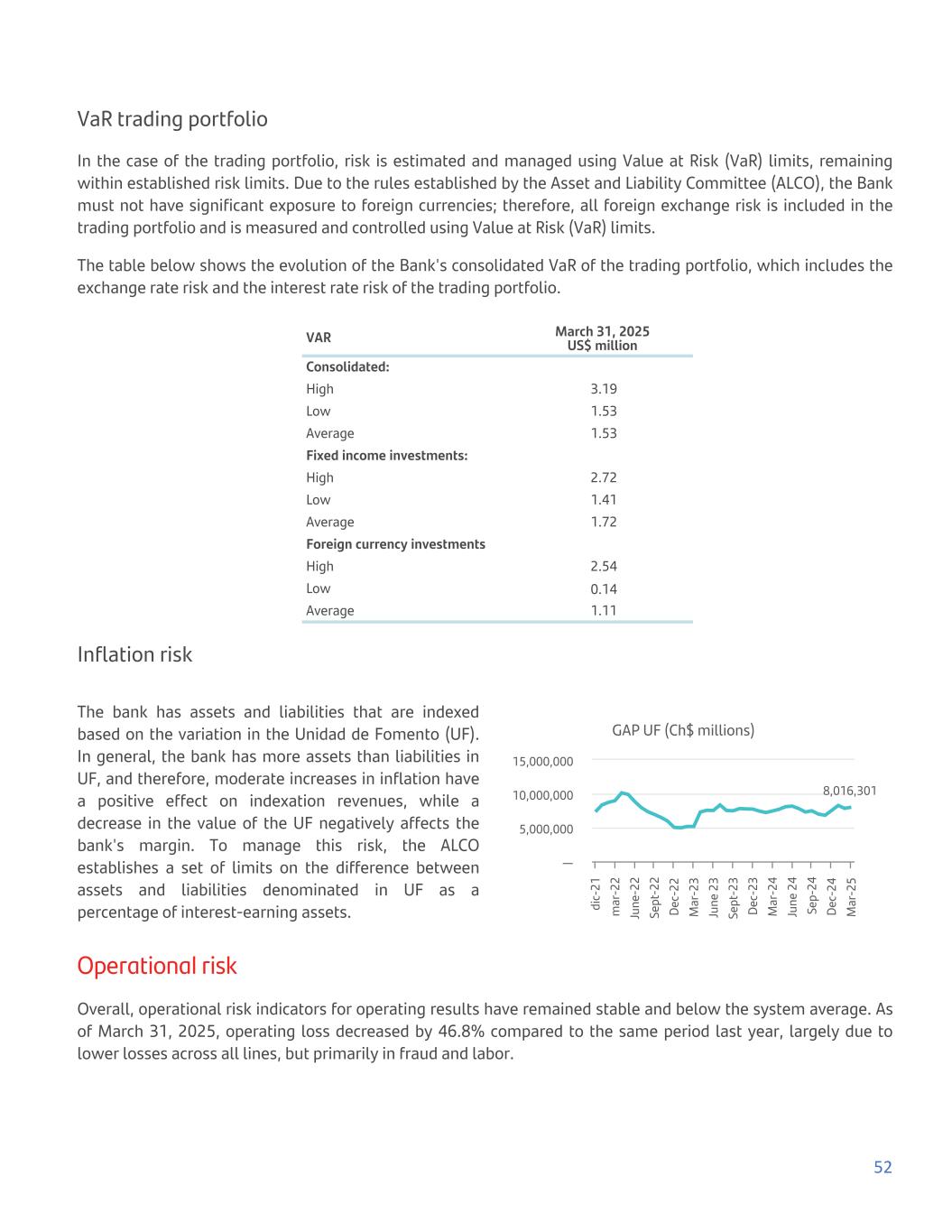 VaR trading portfolio In the case of the trading portfolio, risk is estimated and managed using Value at Risk (VaR) limits, remaining within established risk limits. Due to the rules established by the Asset and Liability Committee (ALCO), the Bank must not have significant exposure to foreign currencies; therefore, all foreign exchange risk is included in the trading portfolio and is measured and controlled using Value at Risk (VaR) limits. The table below shows the evolution of the Bank's consolidated VaR of the trading portfolio, which includes the exchange rate risk and the interest rate risk of the trading portfolio. VAR March 31, 2025 US$ million Consolidated: High 3.19 Low 1.53 Average 1.53 Fixed income investments: High 2.72 Low 1.41 Average 1.72 Foreign currency investments High 2.54 Low 0.14 Average 1.11 Inflation risk The bank has assets and liabilities that are indexed based on the variation in the Unidad de Fomento (UF). In general, the bank has more assets than liabilities in UF, and therefore, moderate increases in inflation have a positive effect on indexation revenues, while a decrease in the value of the UF negatively affects the bank's margin. To manage this risk, the ALCO establishes a set of limits on the difference between assets and liabilities denominated in UF as a percentage of interest-earning assets. GAP UF (Ch$ millions) 8,016,301 di c- 21 m ar -2 2 Ju ne -2 2 Se pt -2 2 De c- 22 M ar -2 3 Ju ne 2 3 Se pt -2 3 De c- 23 M ar -2 4 Ju ne 2 4 Se p- 24 De c- 24 M ar -2 5 — 5,000,000 10,000,000 15,000,000 Operational risk Overall, operational risk indicators for operating results have remained stable and below the system average. As of March 31, 2025, operating loss decreased by 46.8% compared to the same period last year, largely due to lower losses across all lines, but primarily in fraud and labor. 52
