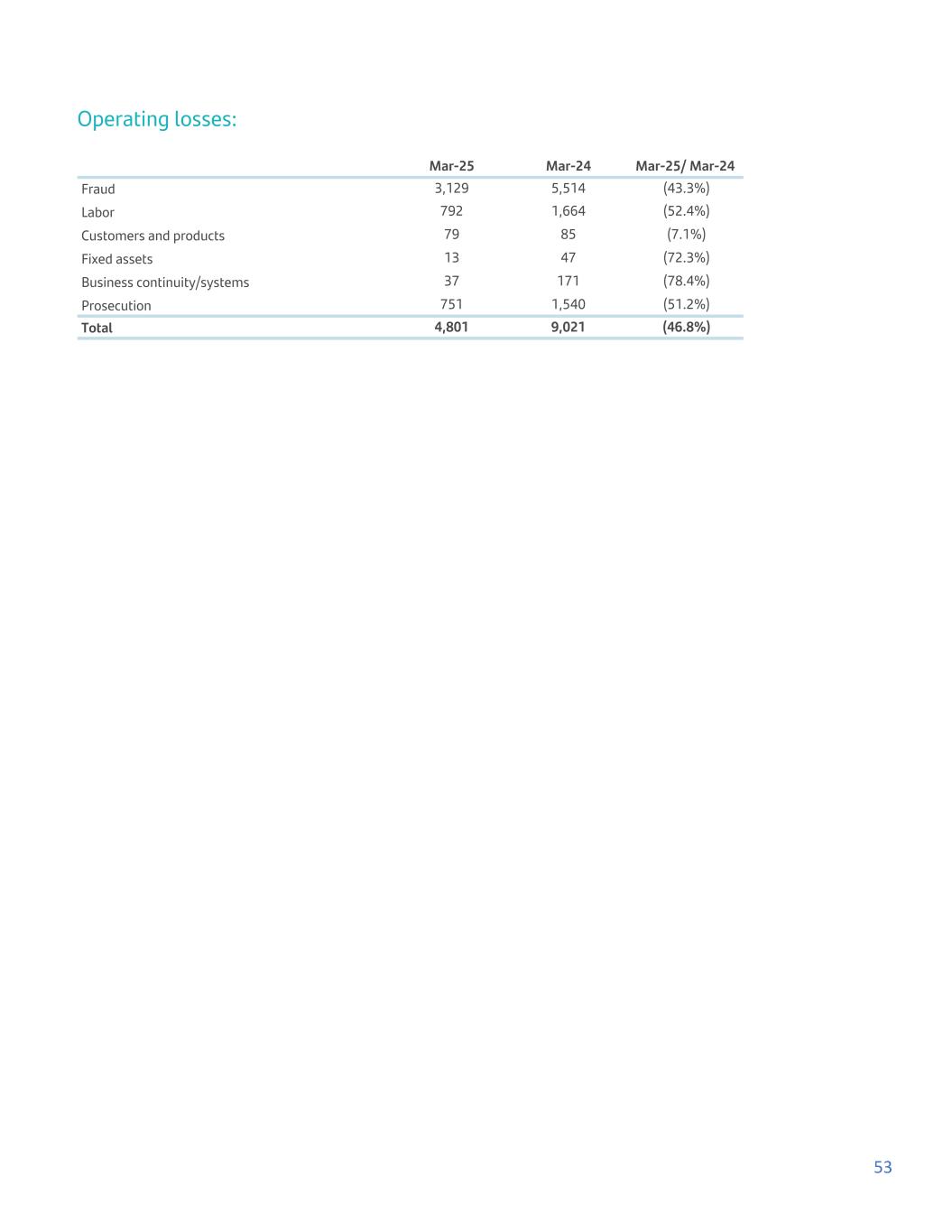 Operating losses: Mar-25 Mar-24 Mar-25/ Mar-24 Fraud 3,129 5,514 (43.3%) Labor 792 1,664 (52.4%) Customers and products 79 85 (7.1%) Fixed assets 13 47 (72.3%) Business continuity/systems 37 171 (78.4%) Prosecution 751 1,540 (51.2%) Total 4,801 9,021 (46.8%) 53