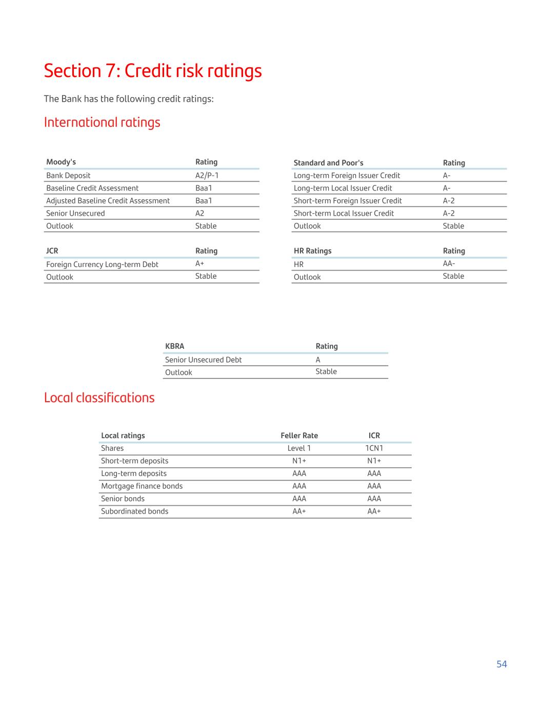 Section 7: Credit risk ratings The Bank has the following credit ratings: International ratings Moody's Rating Bank Deposit A2/P-1 Baseline Credit Assessment Baa1 Adjusted Baseline Credit Assessment Baa1 Senior Unsecured A2 Outlook Stable Standard and Poor's Rating Long-term Foreign Issuer Credit A- Long-term Local Issuer Credit A- Short-term Foreign Issuer Credit A-2 Short-term Local Issuer Credit A-2 Outlook Stable JCR Rating Foreign Currency Long-term Debt A+ Outlook Stable HR Ratings Rating HR AA- Outlook Stable KBRA Rating Senior Unsecured Debt A Outlook Stable Local classifications Local ratings Feller Rate ICR Shares Level 1 1CN1 Short-term deposits N1+ N1+ Long-term deposits AAA AAA Mortgage finance bonds AAA AAA Senior bonds AAA AAA Subordinated bonds AA+ AA+ 54