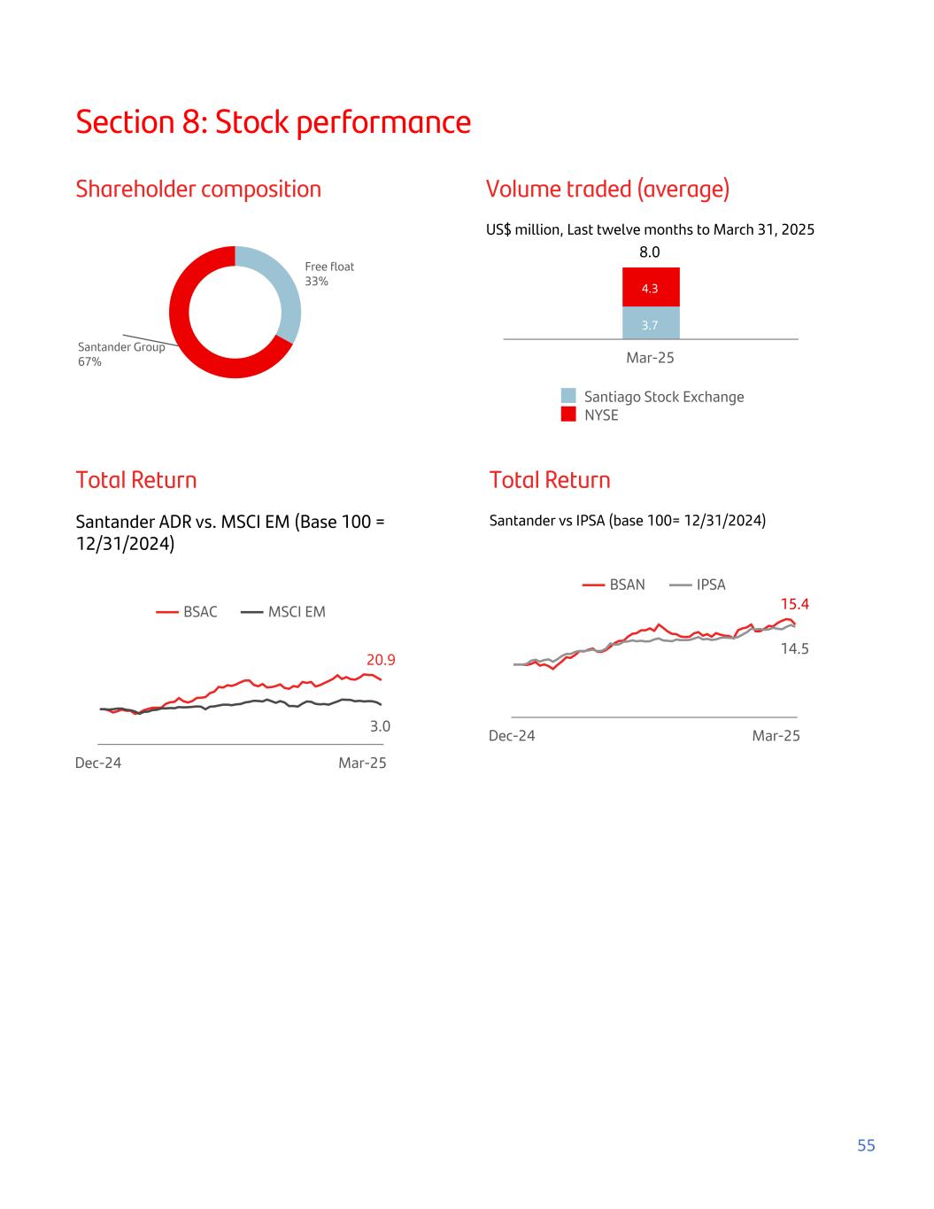 Section 8: Stock performance Shareholder composition Free float 33% Santander Group 67% Volume traded (average) US$ million, Last twelve months to March 31, 2025 8.0 3.7 4.3 Santiago Stock Exchange NYSE Mar-25 Total Return Santander ADR vs. MSCI EM (Base 100 = 12/31/2024) 20.9 3.0 BSAC MSCI EM Dec-24 Mar-25 Total Return Santander vs IPSA (base 100= 12/31/2024) 15.4 14.5 BSAN IPSA Dec-24 Mar-25 55