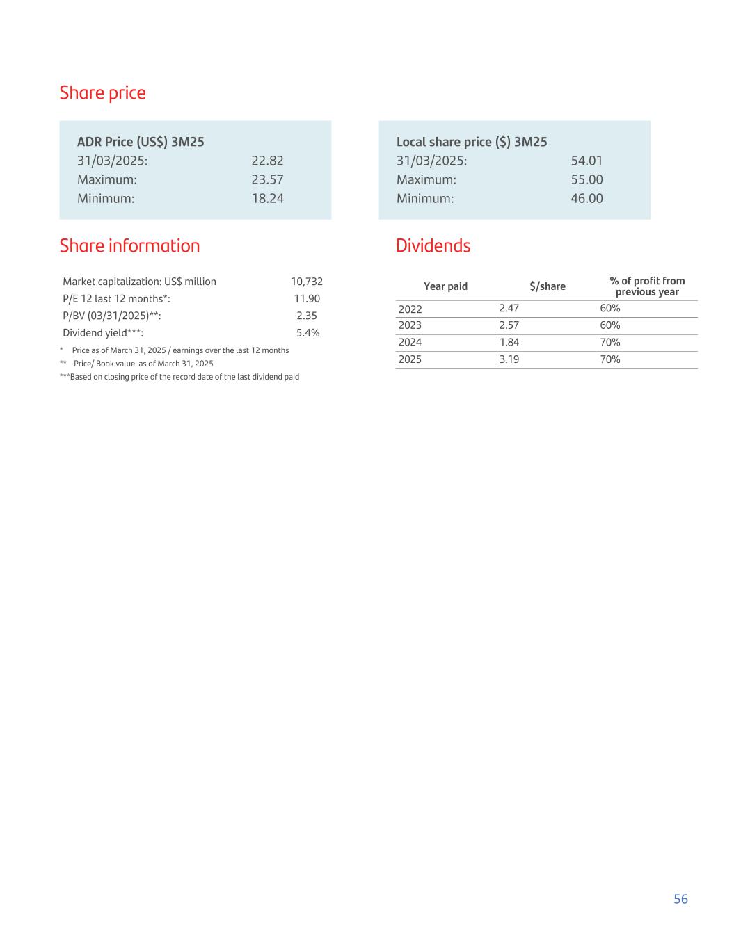 Share price ADR Price (US$) 3M25 Local share price ($) 3M25 31/03/2025: 22.82 31/03/2025: 54.01 Maximum: 23.57 Maximum: 55.00 Minimum: 18.24 Minimum: 46.00 Share information Market capitalization: US$ million 10,732 P/E 12 last 12 months*: 11.90 P/BV (03/31/2025)**: 2.35 Dividend yield***: 5.4% *     Price as of March 31, 2025 / earnings over the last 12 months **    Price/ Book value as of March 31, 2025 ***Based on closing price of the record date of the last dividend paid Dividends Year paid $/share % of profit from previous year 2022 2.47 60% 2023 2.57 60% 2024 1.84 70% 2025 3.19 70% 56