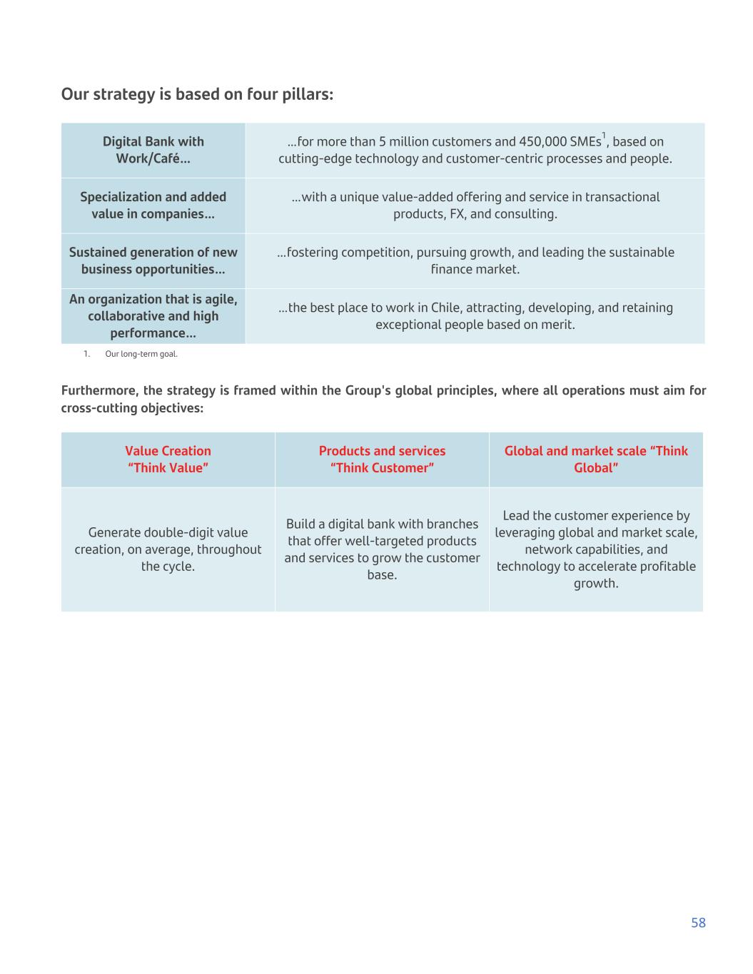 Our strategy is based on four pillars: Digital Bank with Work/Café… …for more than 5 million customers and 450,000 SMEs1, based on cutting-edge technology and customer-centric processes and people. Specialization and added value in companies… …with a unique value-added offering and service in transactional products, FX, and consulting. Sustained generation of new business opportunities… …fostering competition, pursuing growth, and leading the sustainable finance market. An organization that is agile, collaborative and high performance… …the best place to work in Chile, attracting, developing, and retaining exceptional people based on merit. 1. Our long-term goal. Furthermore, the strategy is framed within the Group's global principles, where all operations must aim for cross-cutting objectives: Value Creation “Think Value” Products and services “Think Customer” Global and market scale “Think Global” Generate double-digit value creation, on average, throughout the cycle. Build a digital bank with branches that offer well-targeted products and services to grow the customer base. Lead the customer experience by leveraging global and market scale, network capabilities, and technology to accelerate profitable growth. 58