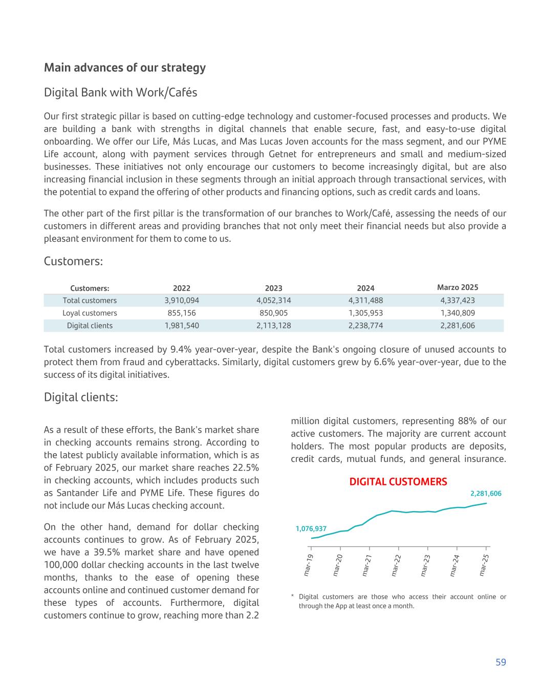 Main advances of our strategy Digital Bank with Work/Cafés Our first strategic pillar is based on cutting-edge technology and customer-focused processes and products. We are building a bank with strengths in digital channels that enable secure, fast, and easy-to-use digital onboarding. We offer our Life, Más Lucas, and Mas Lucas Joven accounts for the mass segment, and our PYME Life account, along with payment services through Getnet for entrepreneurs and small and medium-sized businesses. These initiatives not only encourage our customers to become increasingly digital, but are also increasing financial inclusion in these segments through an initial approach through transactional services, with the potential to expand the offering of other products and financing options, such as credit cards and loans. The other part of the first pillar is the transformation of our branches to Work/Café, assessing the needs of our customers in different areas and providing branches that not only meet their financial needs but also provide a pleasant environment for them to come to us. Customers: Customers: 2022 2023 2024 Marzo 2025 Total customers 3,910,094 4,052,314 4,311,488 4,337,423 Loyal customers 855,156 850,905 1,305,953 1,340,809 Digital clients 1,981,540 2,113,128 2,238,774 2,281,606 Total customers increased by 9.4% year-over-year, despite the Bank's ongoing closure of unused accounts to protect them from fraud and cyberattacks. Similarly, digital customers grew by 6.6% year-over-year, due to the success of its digital initiatives. Digital clients: As a result of these efforts, the Bank's market share in checking accounts remains strong. According to the latest publicly available information, which is as of February 2025, our market share reaches 22.5% in checking accounts, which includes products such as Santander Life and PYME Life. These figures do not include our Más Lucas checking account. On the other hand, demand for dollar checking accounts continues to grow. As of February 2025, we have a 39.5% market share and have opened 100,000 dollar checking accounts in the last twelve months, thanks to the ease of opening these accounts online and continued customer demand for these types of accounts. Furthermore, digital customers continue to grow, reaching more than 2.2 million digital customers, representing 88% of our active customers. The majority are current account holders. The most popular products are deposits, credit cards, mutual funds, and general insurance. DIGITAL CUSTOMERS 1,076,937 2,281,606 m ar -1 9 m ar -2 0 m ar -2 1 m ar -2 2 m ar -2 3 m ar -2 4 m ar -2 5 * Digital customers are those who access their account online or through the App at least once a month. 59