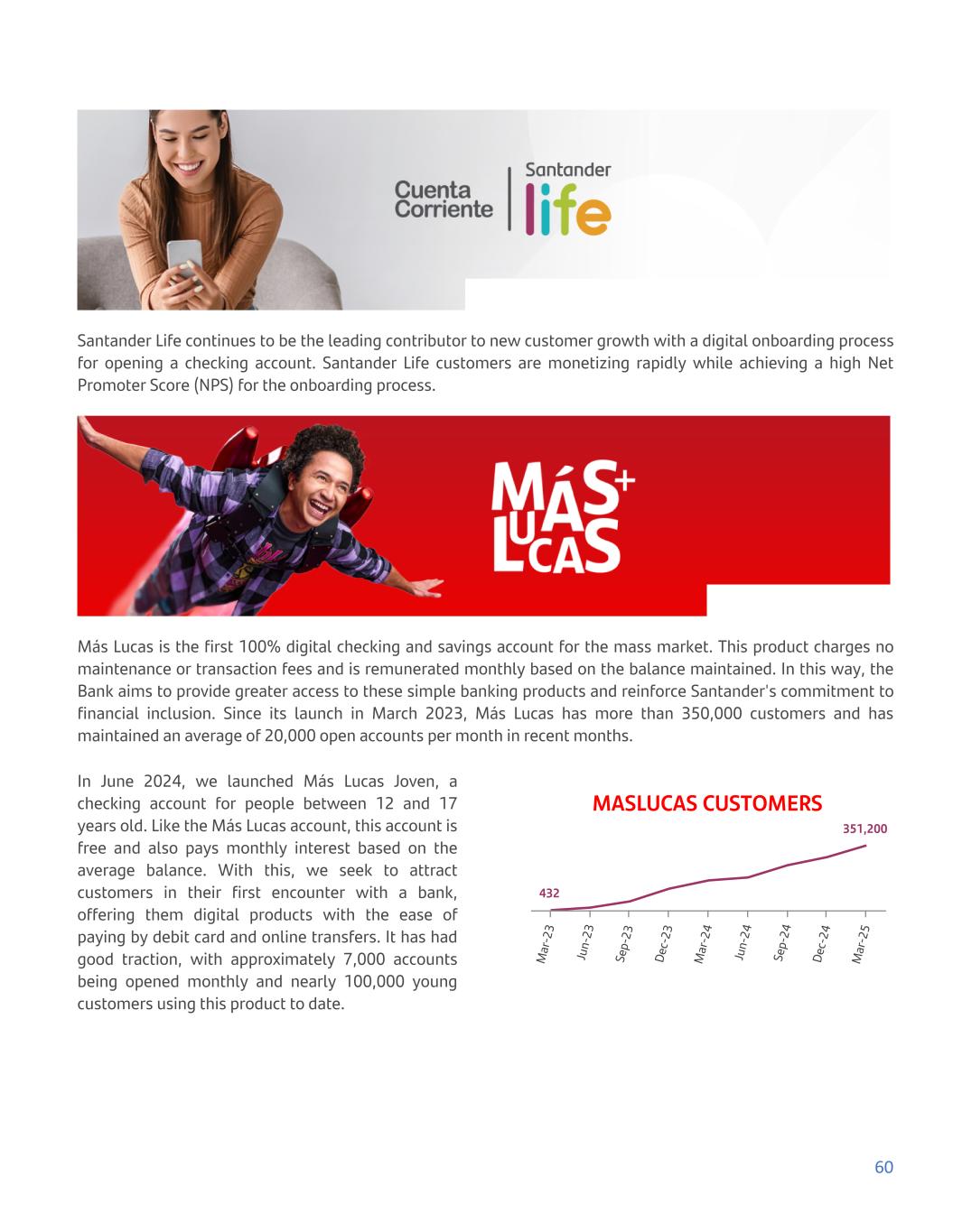 Santander Life continues to be the leading contributor to new customer growth with a digital onboarding process for opening a checking account. Santander Life customers are monetizing rapidly while achieving a high Net Promoter Score (NPS) for the onboarding process. Más Lucas is the first 100% digital checking and savings account for the mass market. This product charges no maintenance or transaction fees and is remunerated monthly based on the balance maintained. In this way, the Bank aims to provide greater access to these simple banking products and reinforce Santander's commitment to financial inclusion. Since its launch in March 2023, Más Lucas has more than 350,000 customers and has maintained an average of 20,000 open accounts per month in recent months. In June 2024, we launched Más Lucas Joven, a checking account for people between 12 and 17 years old. Like the Más Lucas account, this account is free and also pays monthly interest based on the average balance. With this, we seek to attract customers in their first encounter with a bank, offering them digital products with the ease of paying by debit card and online transfers. It has had good traction, with approximately 7,000 accounts being opened monthly and nearly 100,000 young customers using this product to date. MASLUCAS CUSTOMERS 432 351,200 M ar -2 3 Ju n- 23 Se p- 23 De c- 23 M ar -2 4 Ju n- 24 Se p- 24 De c- 24 M ar -2 5 60