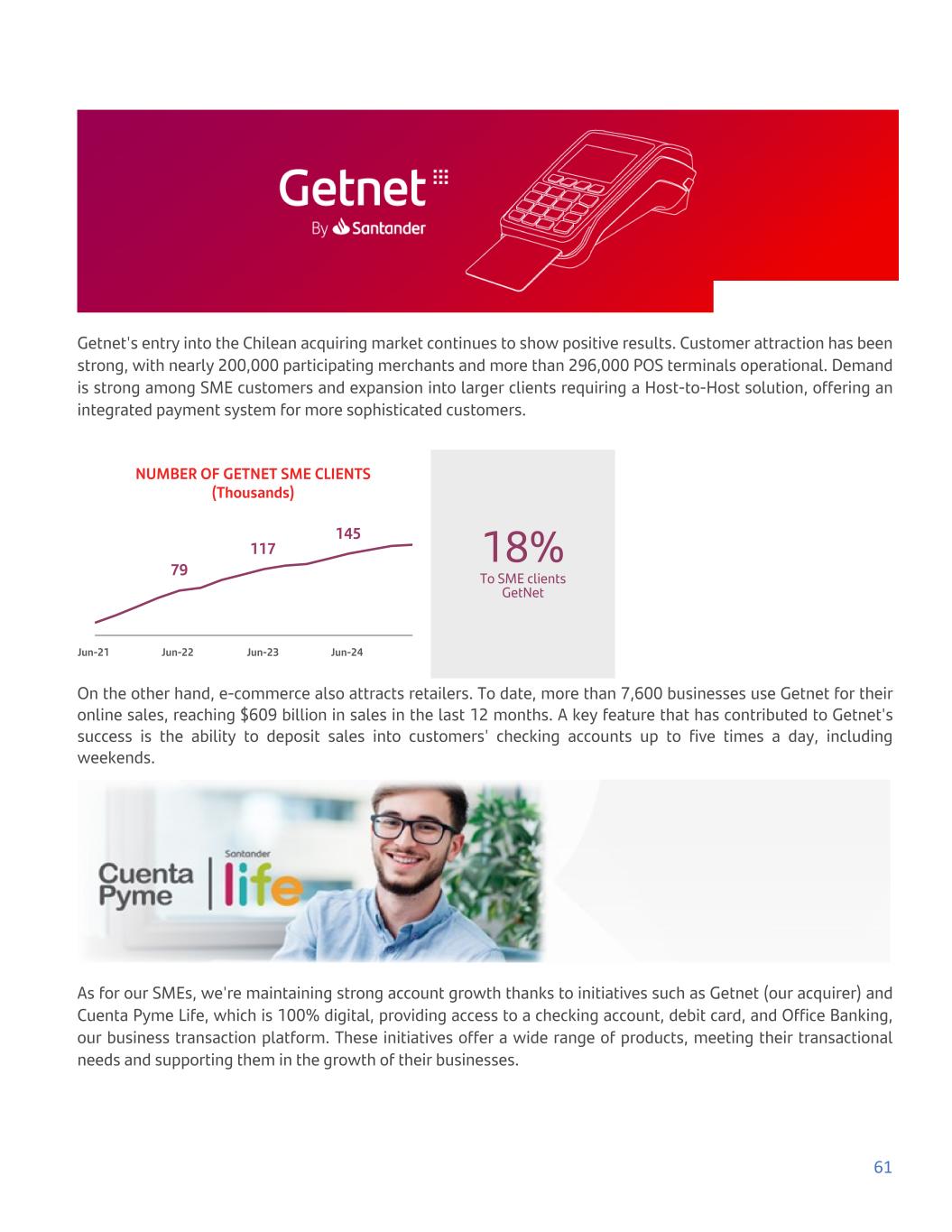 Getnet's entry into the Chilean acquiring market continues to show positive results. Customer attraction has been strong, with nearly 200,000 participating merchants and more than 296,000 POS terminals operational. Demand is strong among SME customers and expansion into larger clients requiring a Host-to-Host solution, offering an integrated payment system for more sophisticated customers. NUMBER OF GETNET SME CLIENTS (Thousands) 79 117 145 Jun-21 Jun-22 Jun-23 Jun-24 18% To SME clients GetNet On the other hand, e-commerce also attracts retailers. To date, more than 7,600 businesses use Getnet for their online sales, reaching $609 billion in sales in the last 12 months. A key feature that has contributed to Getnet's success is the ability to deposit sales into customers' checking accounts up to five times a day, including weekends. As for our SMEs, we're maintaining strong account growth thanks to initiatives such as Getnet (our acquirer) and Cuenta Pyme Life, which is 100% digital, providing access to a checking account, debit card, and Office Banking, our business transaction platform. These initiatives offer a wide range of products, meeting their transactional needs and supporting them in the growth of their businesses. 61