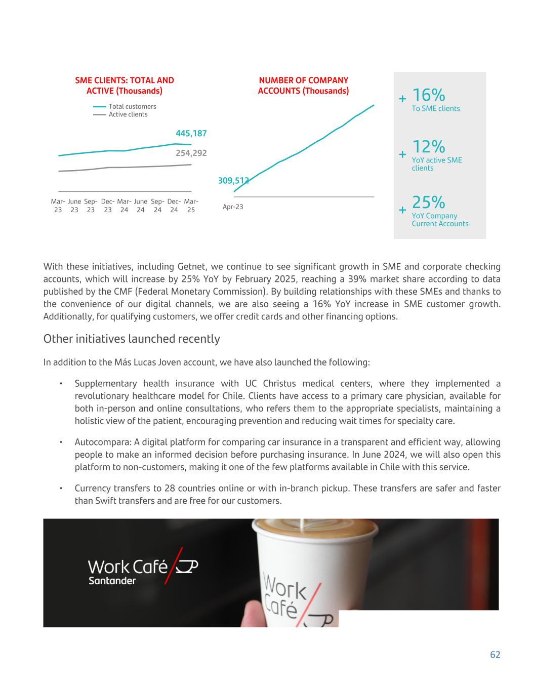 SME CLIENTS: TOTAL AND ACTIVE (Thousands) 445,187 254,292 Total customers Active clients Mar- 23 June 23 Sep- 23 Dec- 23 Mar- 24 June 24 Sep- 24 Dec- 24 Mar- 25 NUMBER OF COMPANY ACCOUNTS (Thousands) 309,512 Apr-23 + 16% To SME clients + 12% YoY active SME clients + 25% YoY Company Current Accounts With these initiatives, including Getnet, we continue to see significant growth in SME and corporate checking accounts, which will increase by 25% YoY by February 2025, reaching a 39% market share according to data published by the CMF (Federal Monetary Commission). By building relationships with these SMEs and thanks to the convenience of our digital channels, we are also seeing a 16% YoY increase in SME customer growth. Additionally, for qualifying customers, we offer credit cards and other financing options. Other initiatives launched recently In addition to the Más Lucas Joven account, we have also launched the following: • Supplementary health insurance with UC Christus medical centers, where they implemented a revolutionary healthcare model for Chile. Clients have access to a primary care physician, available for both in-person and online consultations, who refers them to the appropriate specialists, maintaining a holistic view of the patient, encouraging prevention and reducing wait times for specialty care. • Autocompara: A digital platform for comparing car insurance in a transparent and efficient way, allowing people to make an informed decision before purchasing insurance. In June 2024, we will also open this platform to non-customers, making it one of the few platforms available in Chile with this service. • Currency transfers to 28 countries online or with in-branch pickup. These transfers are safer and faster than Swift transfers and are free for our customers. 62