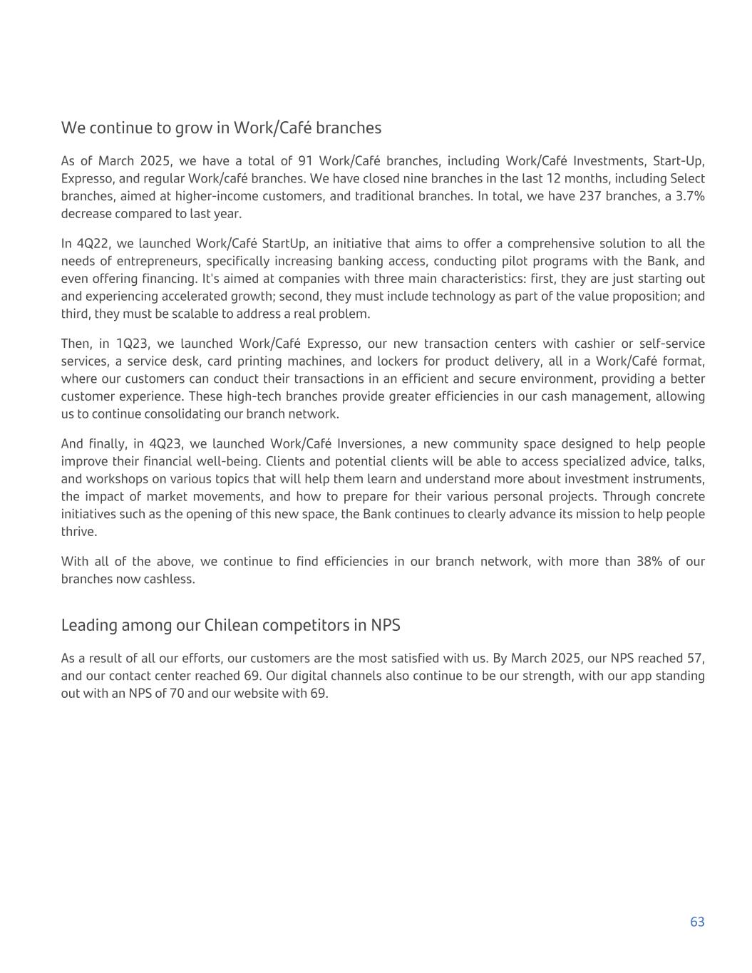 We continue to grow in Work/Café branches As of March 2025, we have a total of 91 Work/Café branches, including Work/Café Investments, Start-Up, Expresso, and regular Work/café branches. We have closed nine branches in the last 12 months, including Select branches, aimed at higher-income customers, and traditional branches. In total, we have 237 branches, a 3.7% decrease compared to last year. In 4Q22, we launched Work/Café StartUp, an initiative that aims to offer a comprehensive solution to all the needs of entrepreneurs, specifically increasing banking access, conducting pilot programs with the Bank, and even offering financing. It's aimed at companies with three main characteristics: first, they are just starting out and experiencing accelerated growth; second, they must include technology as part of the value proposition; and third, they must be scalable to address a real problem. Then, in 1Q23, we launched Work/Café Expresso, our new transaction centers with cashier or self-service services, a service desk, card printing machines, and lockers for product delivery, all in a Work/Café format, where our customers can conduct their transactions in an efficient and secure environment, providing a better customer experience. These high-tech branches provide greater efficiencies in our cash management, allowing us to continue consolidating our branch network. And finally, in 4Q23, we launched Work/Café Inversiones, a new community space designed to help people improve their financial well-being. Clients and potential clients will be able to access specialized advice, talks, and workshops on various topics that will help them learn and understand more about investment instruments, the impact of market movements, and how to prepare for their various personal projects. Through concrete initiatives such as the opening of this new space, the Bank continues to clearly advance its mission to help people thrive. With all of the above, we continue to find efficiencies in our branch network, with more than 38% of our branches now cashless. Leading among our Chilean competitors in NPS As a result of all our efforts, our customers are the most satisfied with us. By March 2025, our NPS reached 57, and our contact center reached 69. Our digital channels also continue to be our strength, with our app standing out with an NPS of 70 and our website with 69. 63