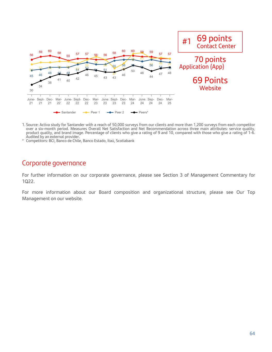 56 59 60 58 55 57 57 56 56 58 60 60 59 59 57 57 51 53 53 54 54 52 56 59 56 47 52 62 63 57 58 57 45 46 48 48 48 51 53 51 51 55 56 56 54 56 54 53 30 34 38 41 40 42 46 45 43 43 46 50 48 44 47 48 Santander Peer 1 Peer 2 Peers* June- 21 Sept- 21 Dec- 21 Mar- 22 June- 22 Sept- 22 Dec- 22 Mar- 23 June 23 Sept- 23 Dec- 23 Mar- 24 June 24 Sep- 24 Dec- 24 Mar- 25 #1 69 points Contact Center 70 points Application (App) 69 Points Website 1. Source: Activa study for Santander with a reach of 50,000 surveys from our clients and more than 1,200 surveys from each competitor over a six-month period. Measures Overall Net Satisfaction and Net Recommendation across three main attributes: service quality, product quality, and brand image. Percentage of clients who give a rating of 9 and 10, compared with those who give a rating of 1-6. Audited by an external provider. * Competitors: BCI, Banco de Chile, Banco Estado, Itaú, Scotiabank Corporate governance For further information on our corporate governance, please see Section 3 of Management Commentary for 1Q22. For more information about our Board composition and organizational structure, please see Our Top Management on our website. 64