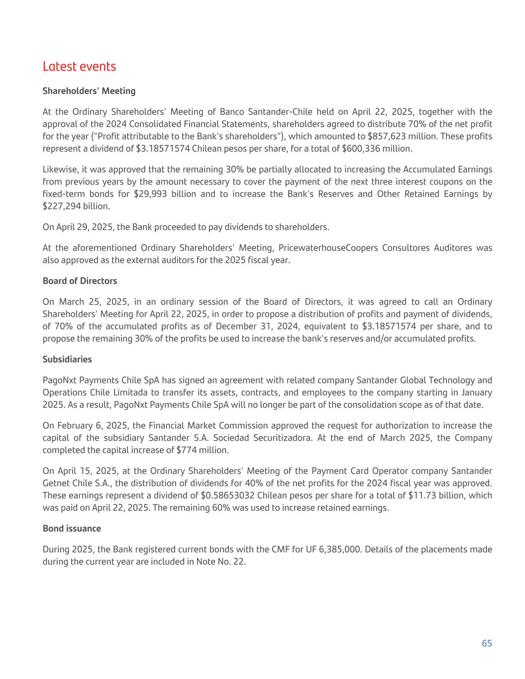 Latest events Shareholders' Meeting At the Ordinary Shareholders' Meeting of Banco Santander-Chile held on April 22, 2025, together with the approval of the 2024 Consolidated Financial Statements, shareholders agreed to distribute 70% of the net profit for the year ("Profit attributable to the Bank's shareholders"), which amounted to $857,623 million. These profits represent a dividend of $3.18571574 Chilean pesos per share, for a total of $600,336 million. Likewise, it was approved that the remaining 30% be partially allocated to increasing the Accumulated Earnings from previous years by the amount necessary to cover the payment of the next three interest coupons on the fixed-term bonds for $29,993 billion and to increase the Bank's Reserves and Other Retained Earnings by $227,294 billion. On April 29, 2025, the Bank proceeded to pay dividends to shareholders. At the aforementioned Ordinary Shareholders' Meeting, PricewaterhouseCoopers Consultores Auditores was also approved as the external auditors for the 2025 fiscal year. Board of Directors On March 25, 2025, in an ordinary session of the Board of Directors, it was agreed to call an Ordinary Shareholders' Meeting for April 22, 2025, in order to propose a distribution of profits and payment of dividends, of 70% of the accumulated profits as of December 31, 2024, equivalent to $3.18571574 per share, and to propose the remaining 30% of the profits be used to increase the bank's reserves and/or accumulated profits. Subsidiaries PagoNxt Payments Chile SpA has signed an agreement with related company Santander Global Technology and Operations Chile Limitada to transfer its assets, contracts, and employees to the company starting in January 2025. As a result, PagoNxt Payments Chile SpA will no longer be part of the consolidation scope as of that date. On February 6, 2025, the Financial Market Commission approved the request for authorization to increase the capital of the subsidiary Santander S.A. Sociedad Securitizadora. At the end of March 2025, the Company completed the capital increase of $774 million. On April 15, 2025, at the Ordinary Shareholders' Meeting of the Payment Card Operator company Santander Getnet Chile S.A., the distribution of dividends for 40% of the net profits for the 2024 fiscal year was approved. These earnings represent a dividend of $0.58653032 Chilean pesos per share for a total of $11.73 billion, which was paid on April 22, 2025. The remaining 60% was used to increase retained earnings. Bond issuance During 2025, the Bank registered current bonds with the CMF for UF 6,385,000. Details of the placements made during the current year are included in Note No. 22. 65