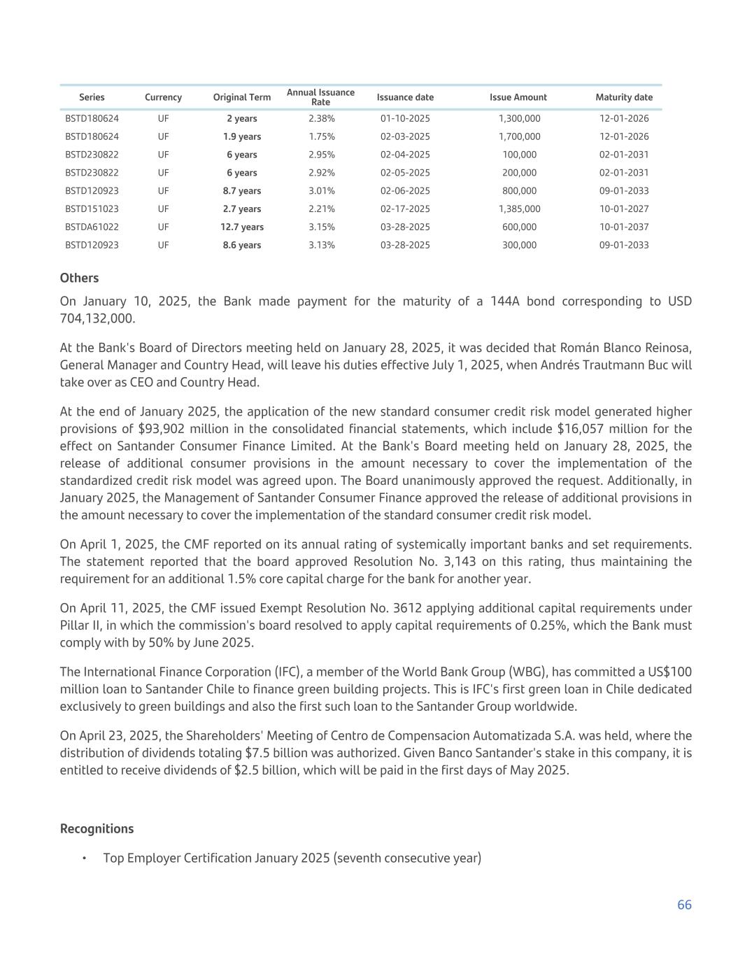 Series Currency Original Term Annual Issuance Rate Issuance date Issue Amount Maturity date BSTD180624 UF 2 years 2.38% 01-10-2025 1,300,000 12-01-2026 BSTD180624 UF 1.9 years 1.75% 02-03-2025 1,700,000 12-01-2026 BSTD230822 UF 6 years 2.95% 02-04-2025 100,000 02-01-2031 BSTD230822 UF 6 years 2.92% 02-05-2025 200,000 02-01-2031 BSTD120923 UF 8.7 years 3.01% 02-06-2025 800,000 09-01-2033 BSTD151023 UF 2.7 years 2.21% 02-17-2025 1,385,000 10-01-2027 BSTDA61022 UF 12.7 years 3.15% 03-28-2025 600,000 10-01-2037 BSTD120923 UF 8.6 years 3.13% 03-28-2025 300,000 09-01-2033 Others On January 10, 2025, the Bank made payment for the maturity of a 144A bond corresponding to USD 704,132,000. At the Bank's Board of Directors meeting held on January 28, 2025, it was decided that Román Blanco Reinosa, General Manager and Country Head, will leave his duties effective July 1, 2025, when Andrés Trautmann Buc will take over as CEO and Country Head. At the end of January 2025, the application of the new standard consumer credit risk model generated higher provisions of $93,902 million in the consolidated financial statements, which include $16,057 million for the effect on Santander Consumer Finance Limited. At the Bank's Board meeting held on January 28, 2025, the release of additional consumer provisions in the amount necessary to cover the implementation of the standardized credit risk model was agreed upon. The Board unanimously approved the request. Additionally, in January 2025, the Management of Santander Consumer Finance approved the release of additional provisions in the amount necessary to cover the implementation of the standard consumer credit risk model. On April 1, 2025, the CMF reported on its annual rating of systemically important banks and set requirements. The statement reported that the board approved Resolution No. 3,143 on this rating, thus maintaining the requirement for an additional 1.5% core capital charge for the bank for another year. On April 11, 2025, the CMF issued Exempt Resolution No. 3612 applying additional capital requirements under Pillar II, in which the commission's board resolved to apply capital requirements of 0.25%, which the Bank must comply with by 50% by June 2025. The International Finance Corporation (IFC), a member of the World Bank Group (WBG), has committed a US$100 million loan to Santander Chile to finance green building projects. This is IFC's first green loan in Chile dedicated exclusively to green buildings and also the first such loan to the Santander Group worldwide. On April 23, 2025, the Shareholders' Meeting of Centro de Compensacion Automatizada S.A. was held, where the distribution of dividends totaling $7.5 billion was authorized. Given Banco Santander's stake in this company, it is entitled to receive dividends of $2.5 billion, which will be paid in the first days of May 2025. Recognitions • Top Employer Certification January 2025 (seventh consecutive year) 66