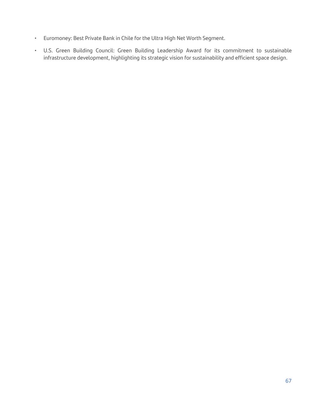 • Euromoney: Best Private Bank in Chile for the Ultra High Net Worth Segment. • U.S. Green Building Council: Green Building Leadership Award for its commitment to sustainable infrastructure development, highlighting its strategic vision for sustainability and efficient space design. 67